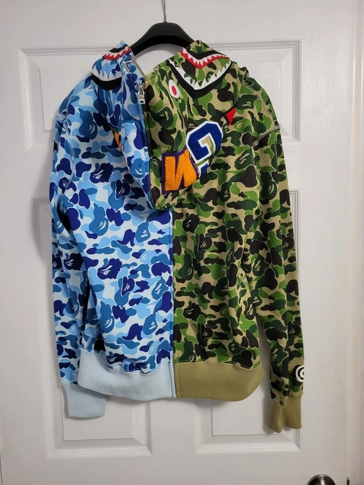 Blue and green Bape camo double hoodie. Size Large but fits like a Medium. Lightly worn, in great condition. Perfect for layering or streetwear style.