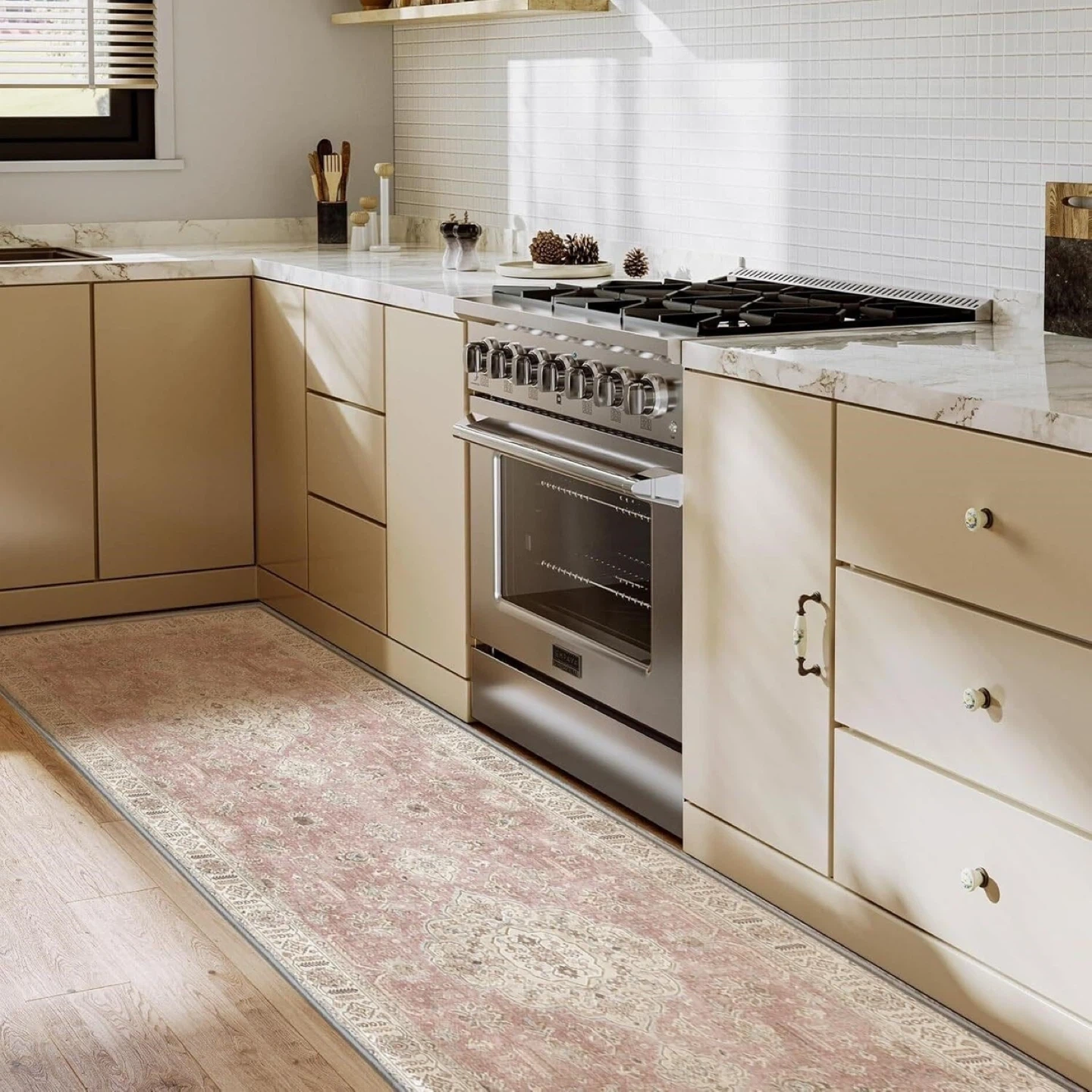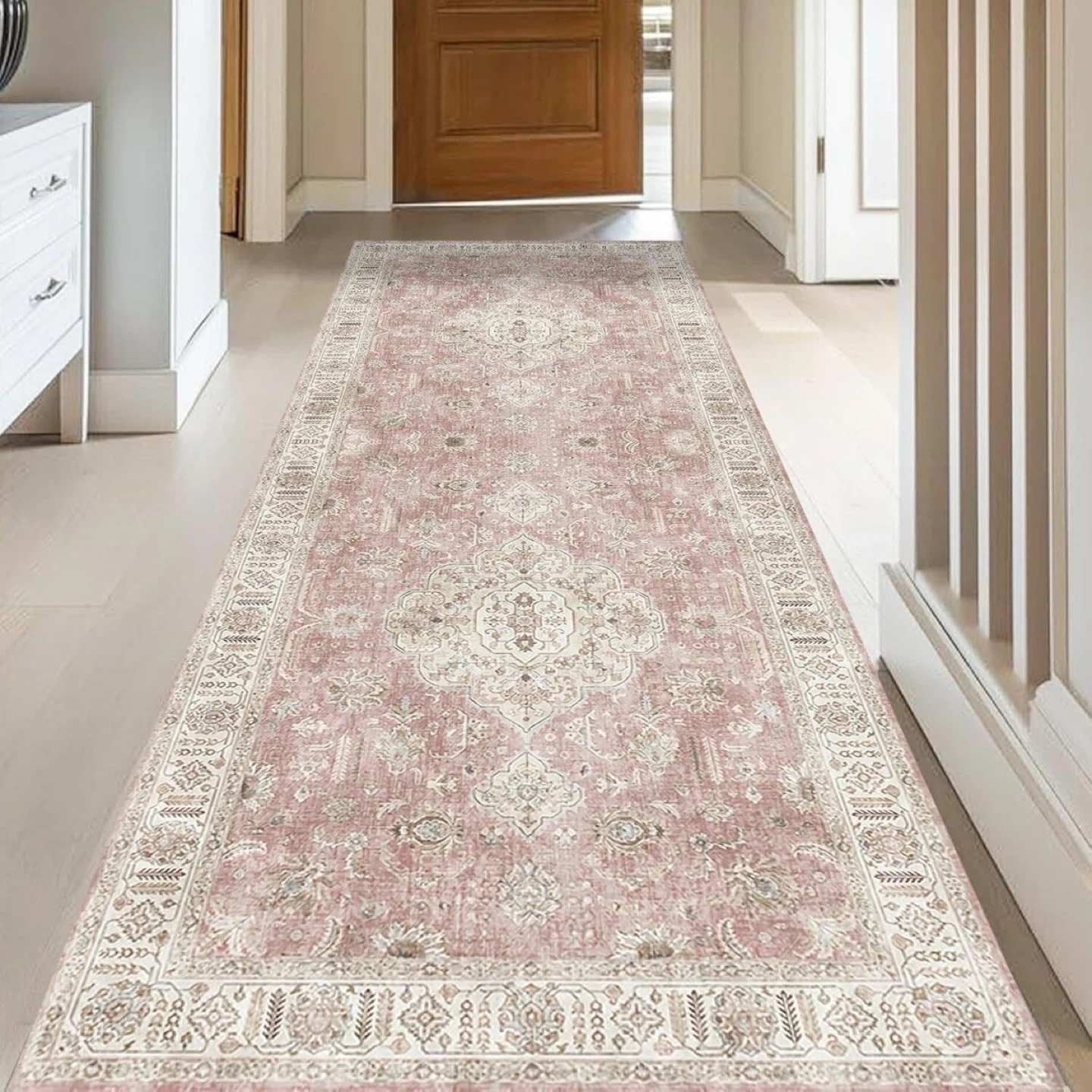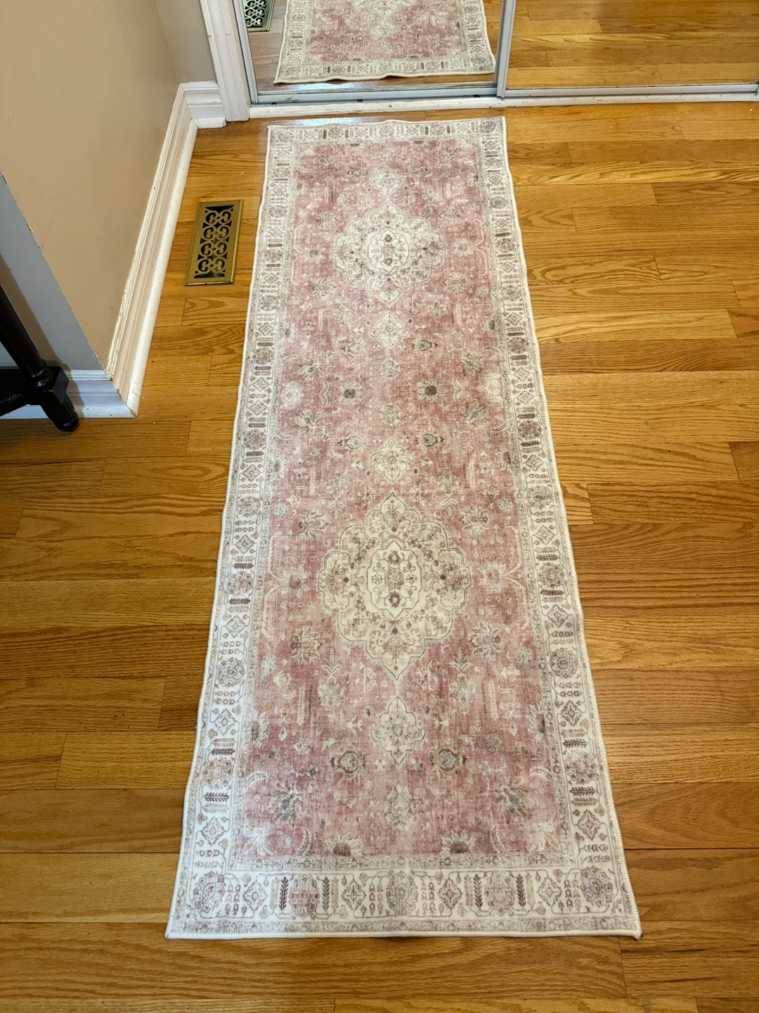 Here's a lovely pink runner rug! It measures 2 feet by 6 feet. Perfect for adding a touch of warmth and style to any hallway or kitchen