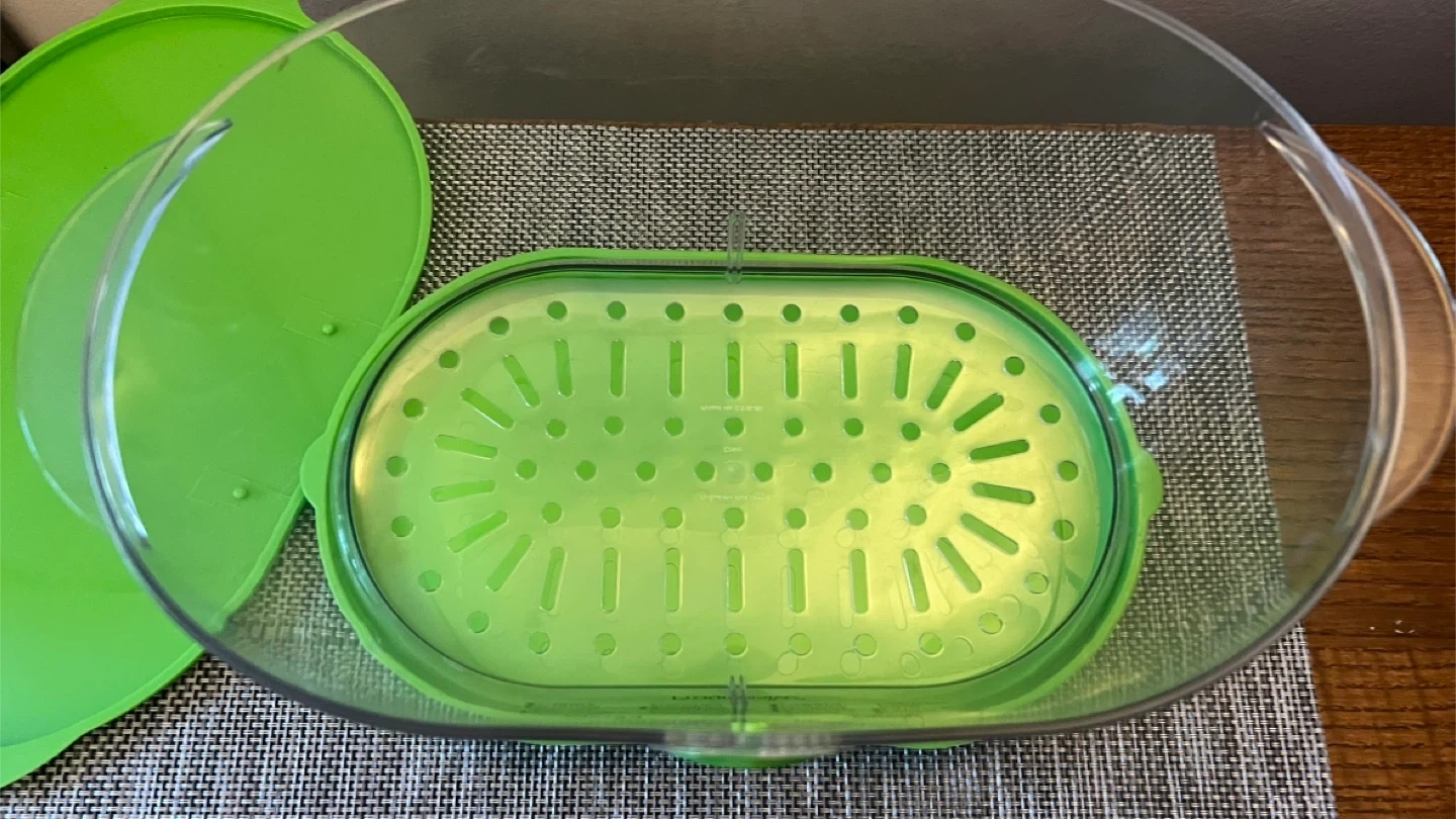 Adjustable side vent regulates air circulation and moisture, with a guide noting which fruits and vegetables should be stored open or closed.