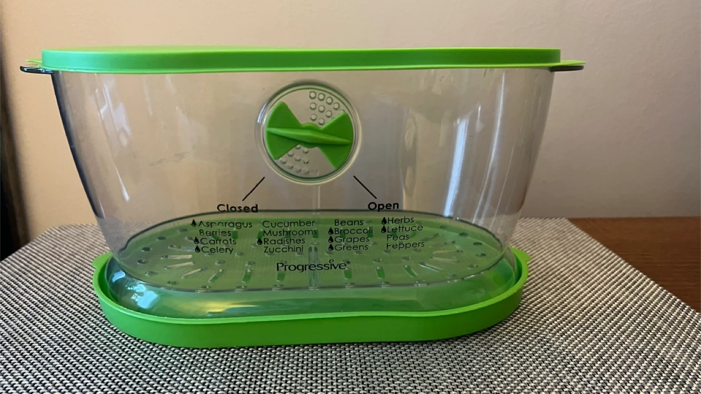 Adjustable side vent regulates air circulation and moisture, with a guide noting which fruits and vegetables should be stored open or closed.