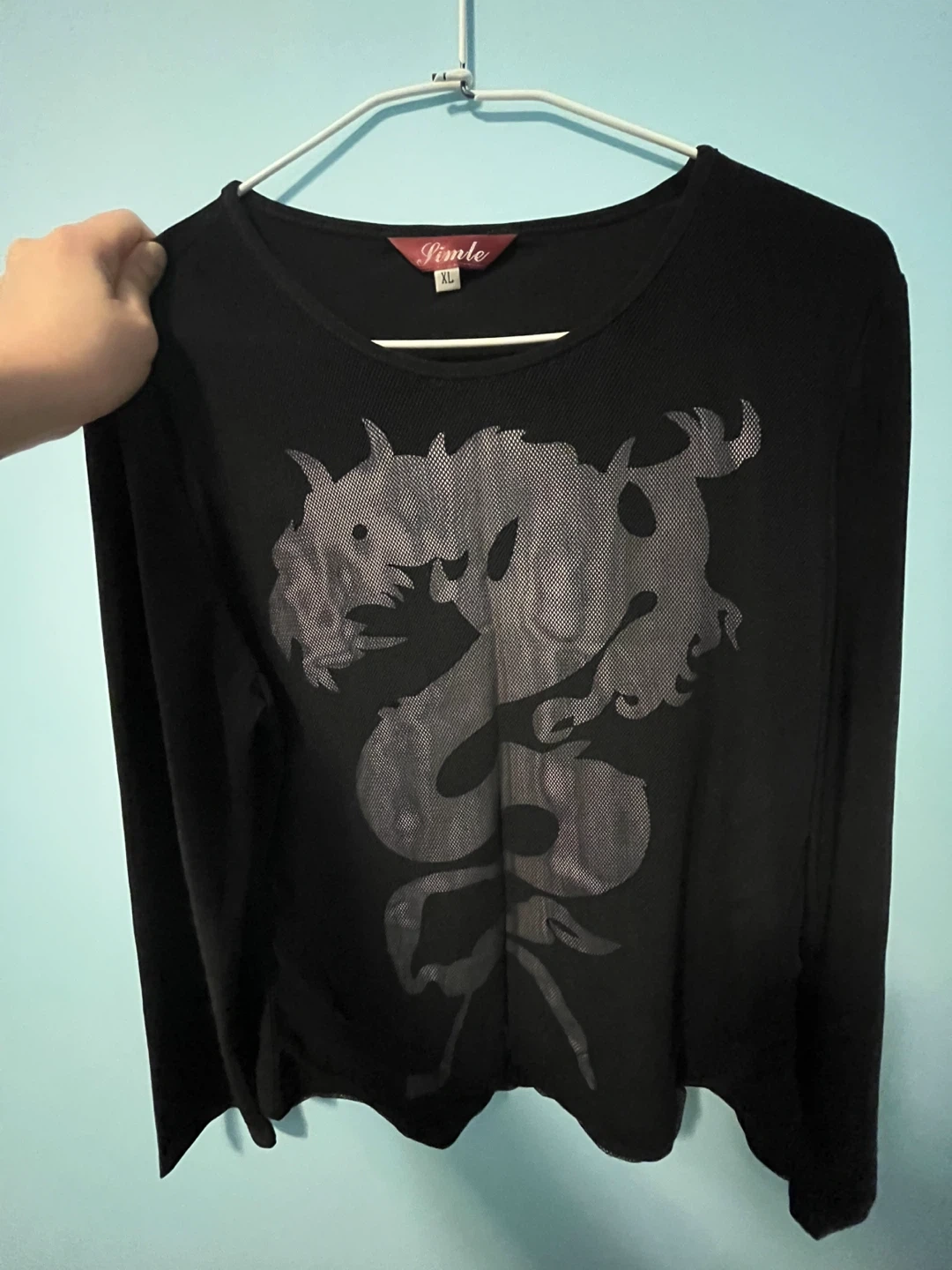 Selling a long sleeve top! It features a cool dragon design on the front. The shirt is black and in great condition!