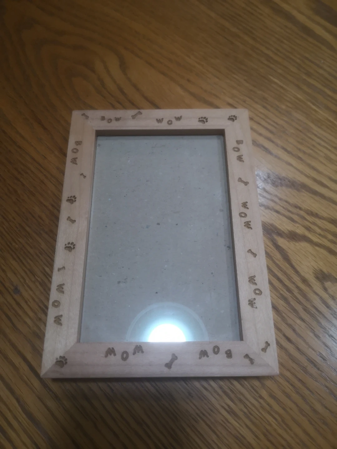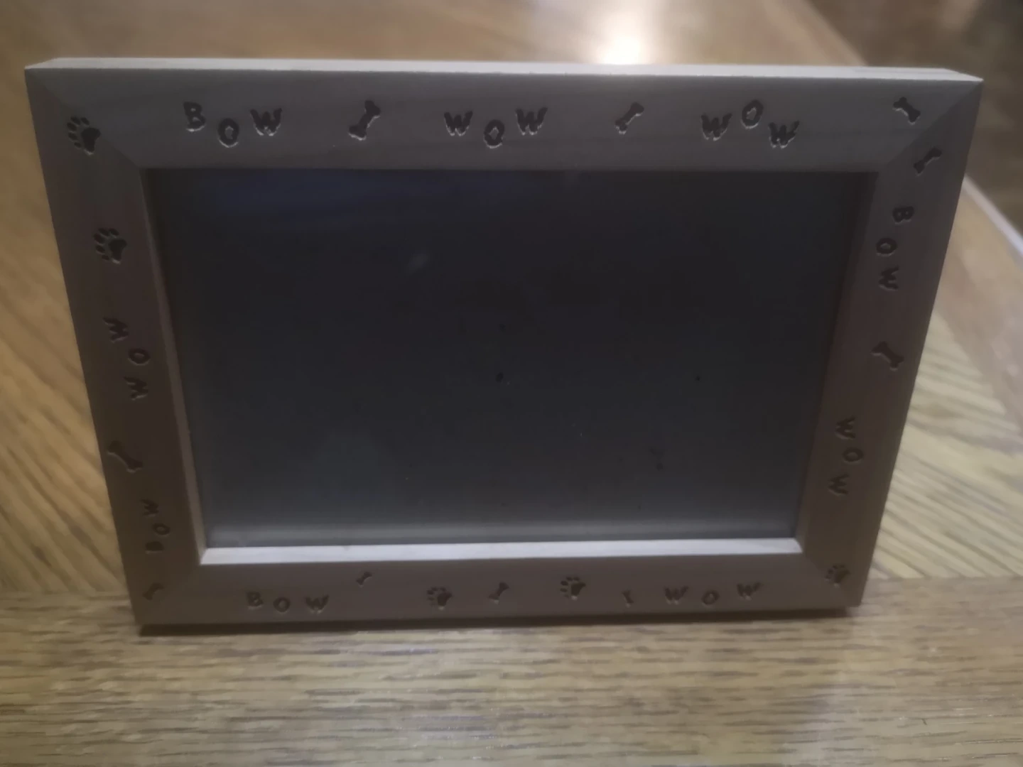 Selling a cute wood picture frame with a dog theme! It has little paw prints, bones, and the words 'bow' and 'wow' etched into the frame. Perfect for showing off your furry friend.
