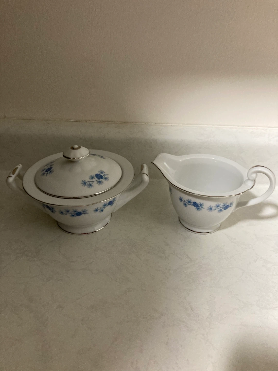 Here's a charming vintage sugar bowl with lid and creamer set! It features a delicate blue floral design with silver trim. Perfect for adding a touch of elegance to your tea or coffee service