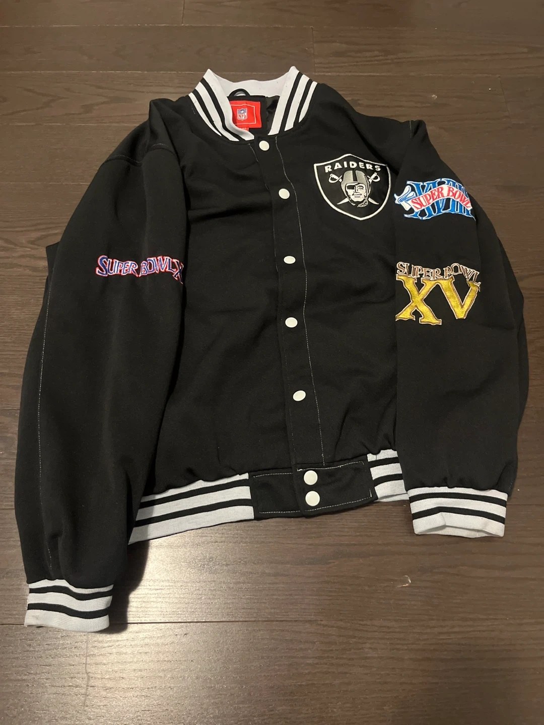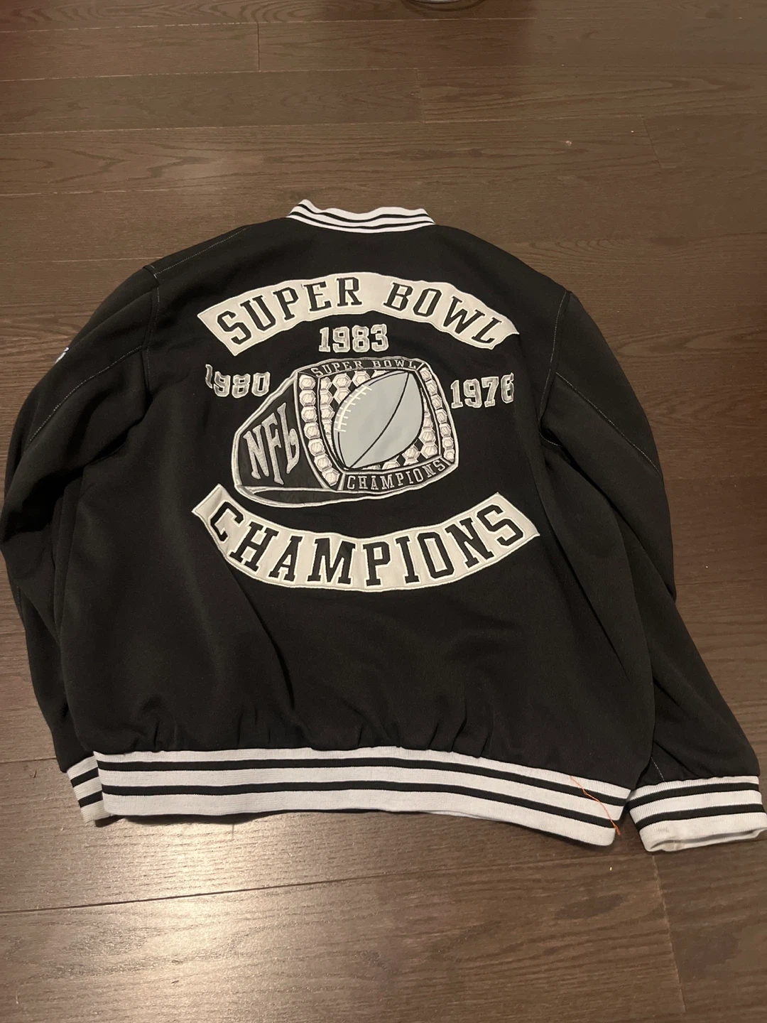 Selling an NFL Raiders Super Bowl Champions jacket. It's in great condition and features the Raiders logo, Super Bowl XV patch, and a large graphic on the back celebrating their Super Bowl wins in 1976, 1980, and 1983. A great piece for any Raiders fan!