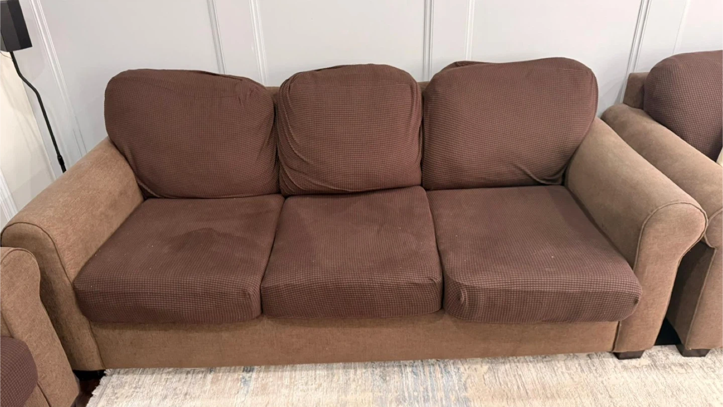 Selling a comfy brown sofa set! Includes a three-seater sofa, a two-seater sofa, and an armchair. Perfect for a living room or family room setup. It's in good condition and ready for a new home!