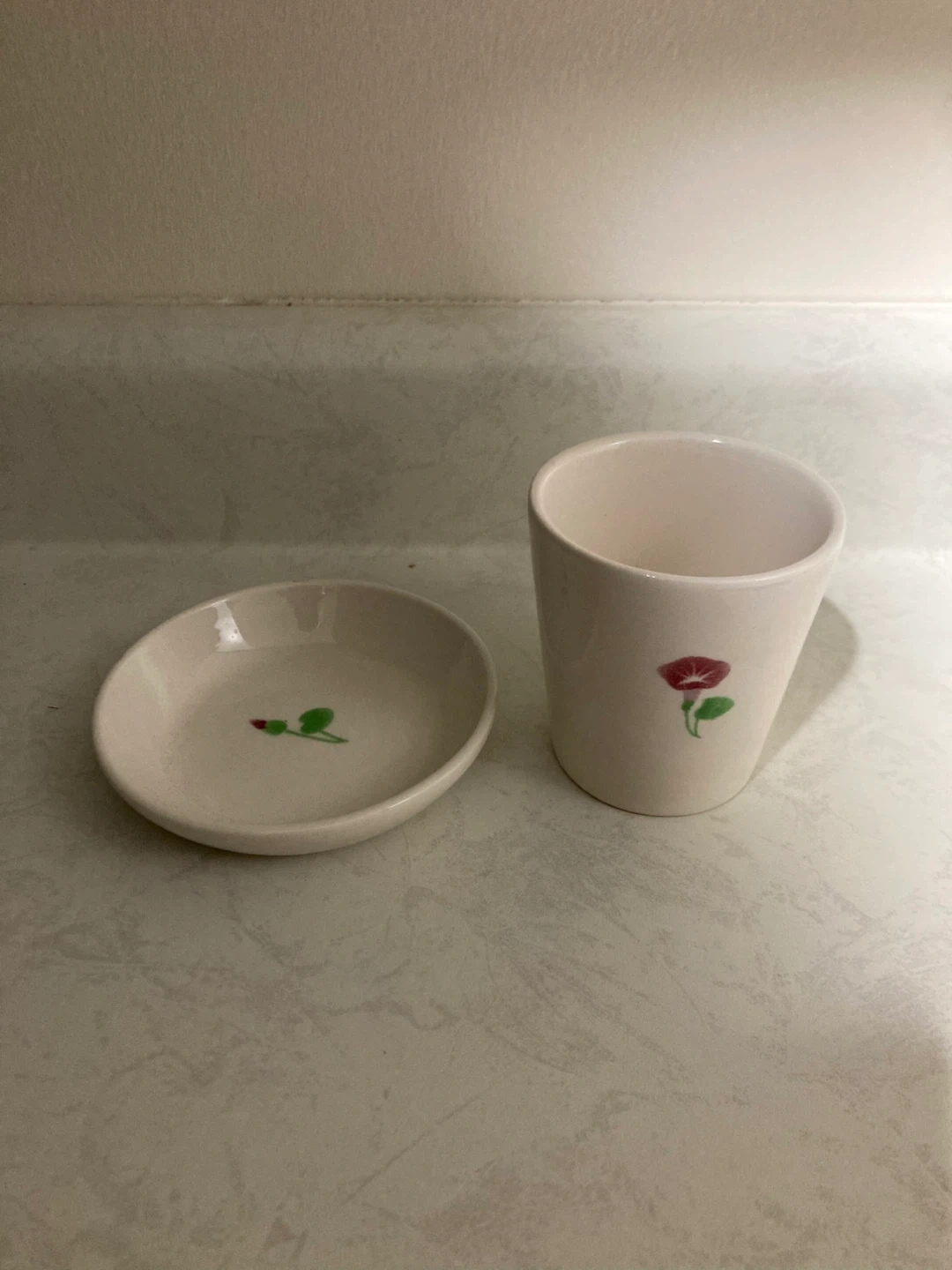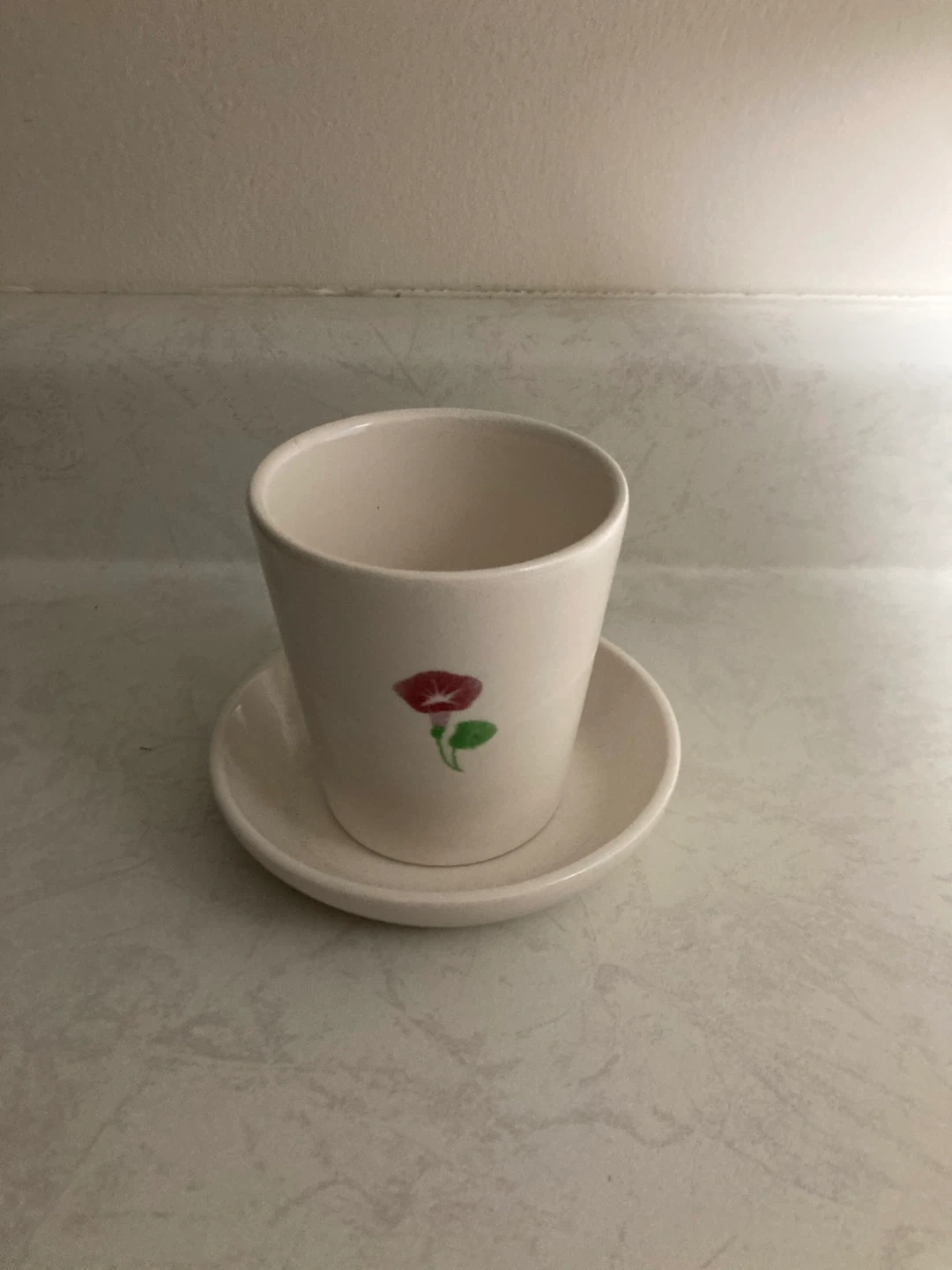 A cute little ceramic flower tea cup with a matching saucer! It has a simple, elegant design with a small flower detail on both the cup and the saucer.