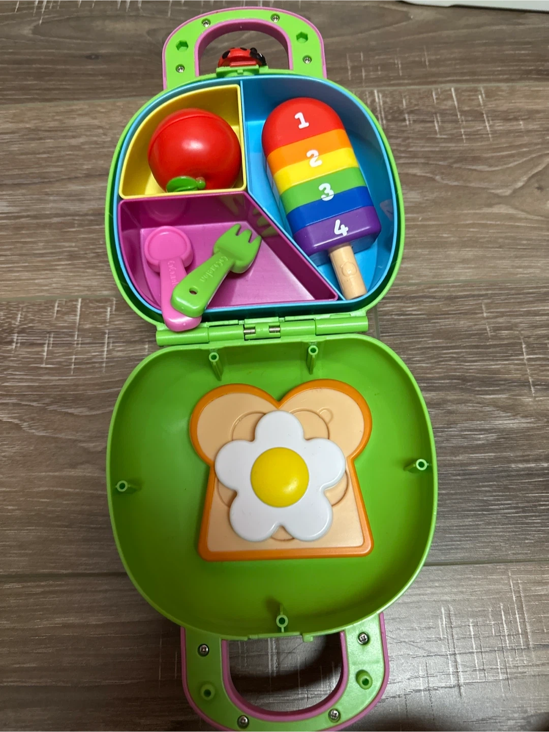 This CoComelon lunchbox playset is ready for a new friend! It includes a variety of play food items, such as a sandwich, apple, and popsicle. Perfect for imaginative play and learning about numbers and colours