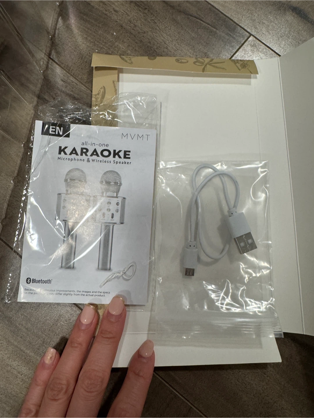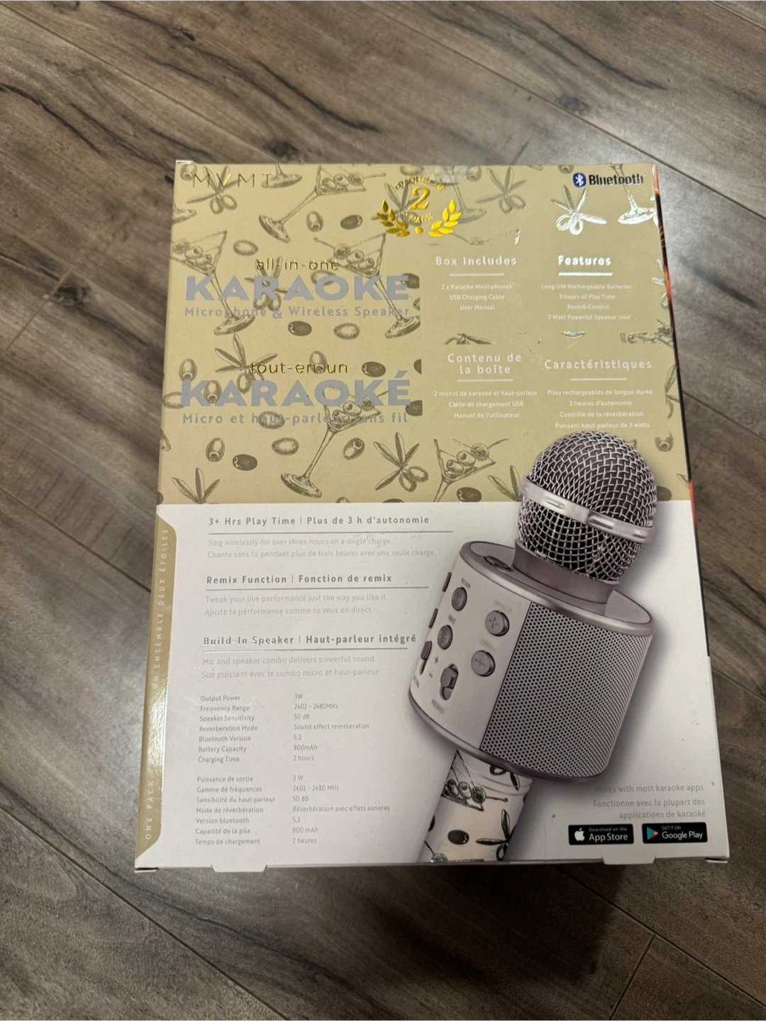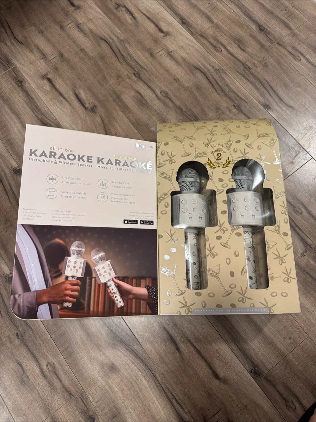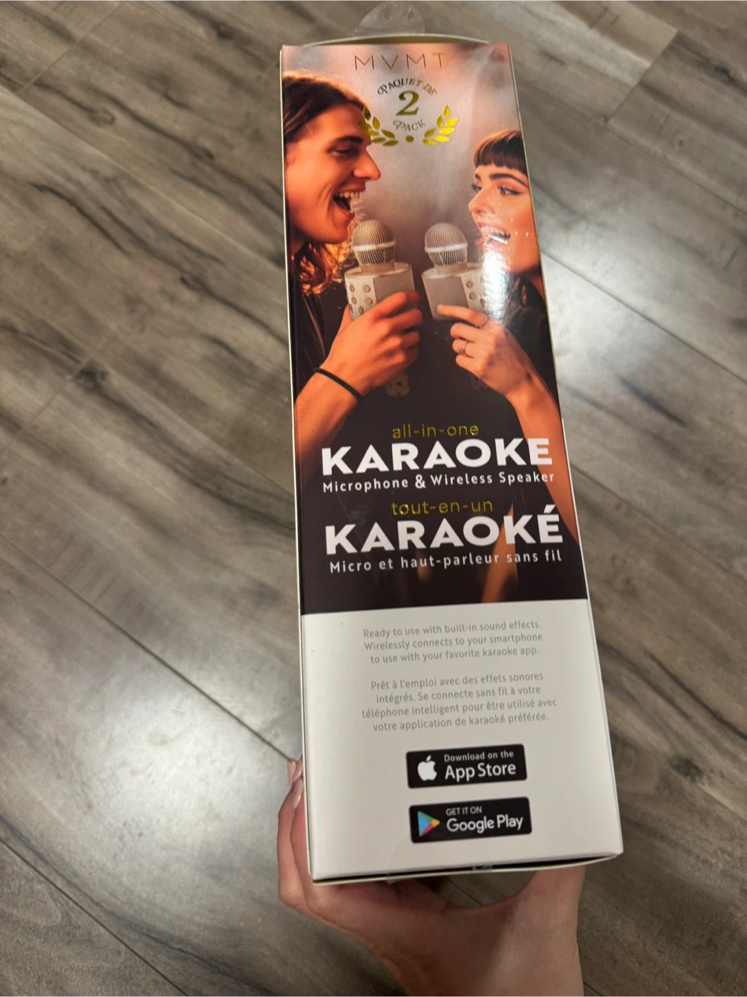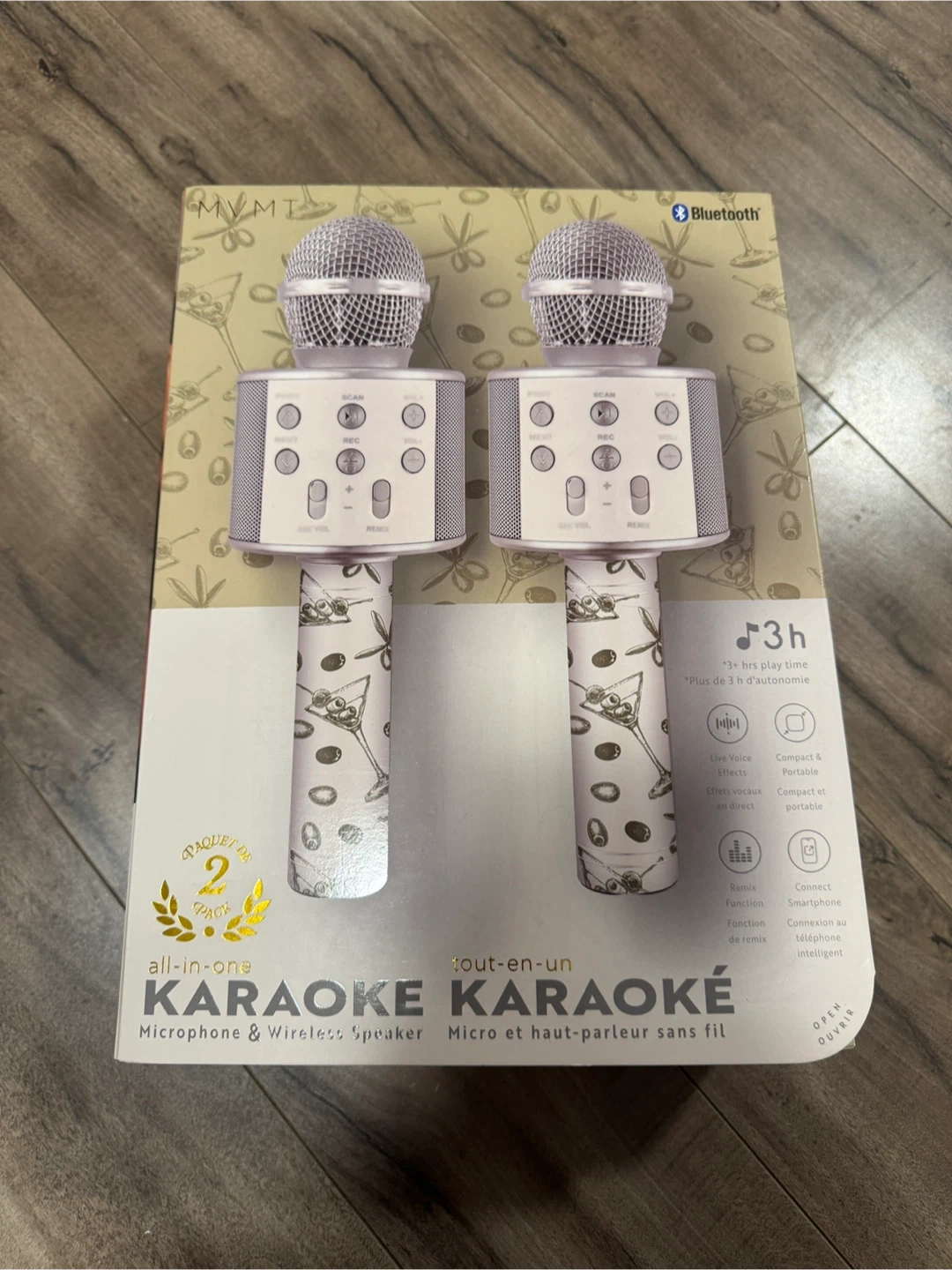 Selling a brand new MVMT All-in-One Karaoke Microphone and Wireless Speaker set! This set comes with two microphones, perfect for duets or karaoke parties. It features live voice effects, a remix function, and connects to your smartphone. The microphones are compact and portable, offering up to 3 hours of playtime. Comes with the box and all original components!