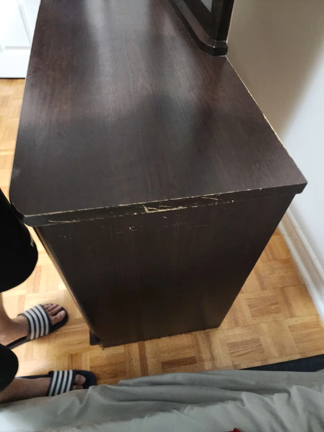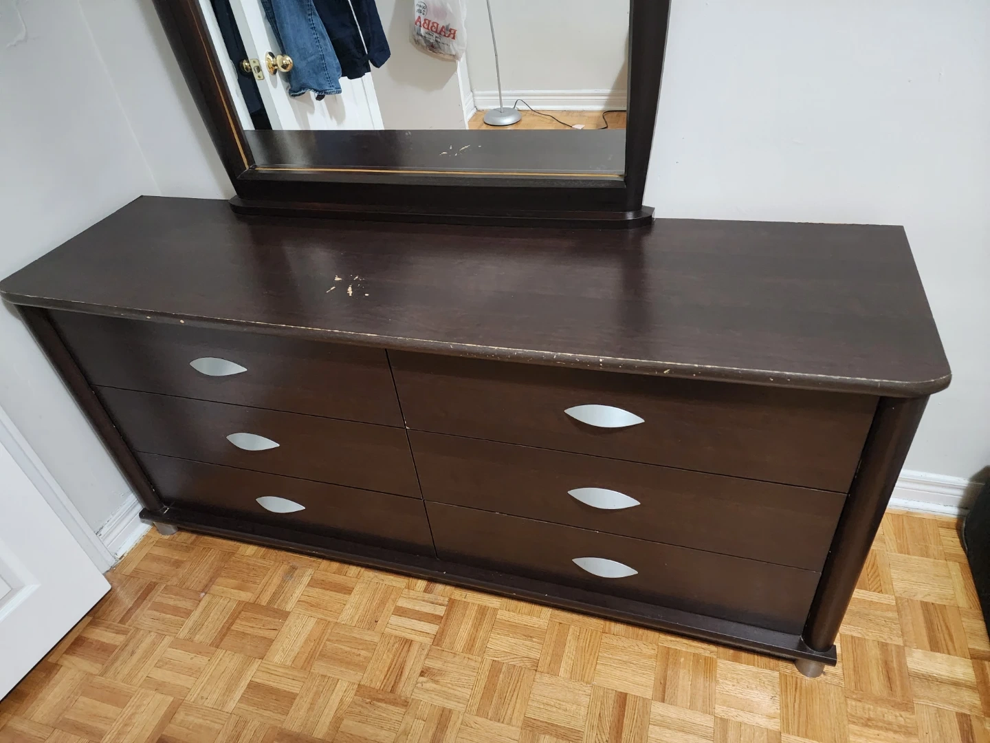 Dark brown dresser with a mirror. There are some scratches on the top surface and edges. Please see the photos for details! Move out Sale! Pick up requests only