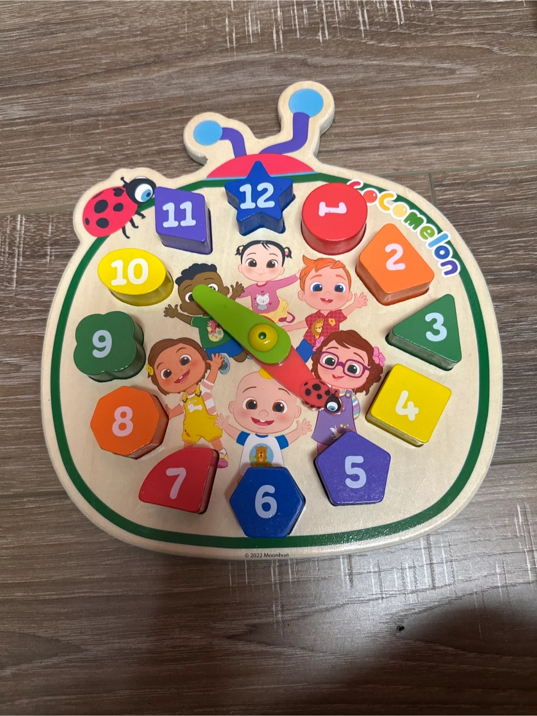 This is a cute Cocomelon wooden clock puzzle with shape sorting! It's a fun way for kids to learn about numbers, shapes, and telling time with their favourite Cocomelon characters