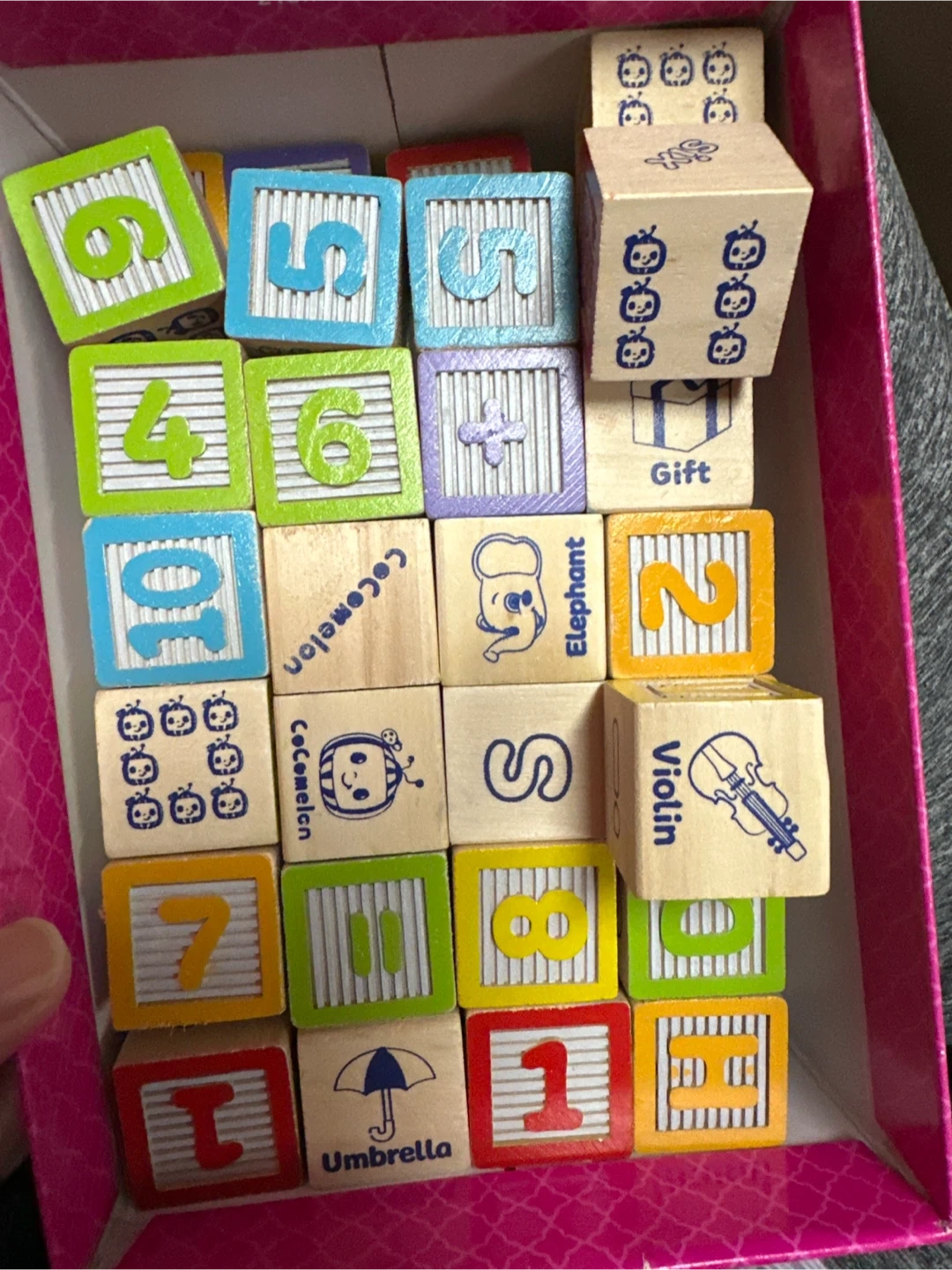 A set of colourful wooden blocks with letters, numbers, and pictures! Great for little ones learning their ABCs and 123s. Each block features a different letter, number, or image, like an umbrella or a violin. Perfect for educational play!