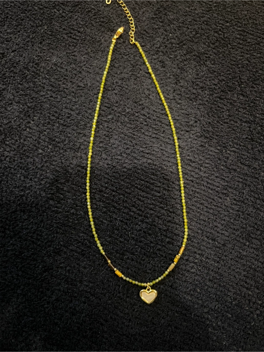 A cute heart pendant hangs from this beaded necklace. The beads are a mix of colours, including gold and brown. This would be a great accessory to add to your collection!