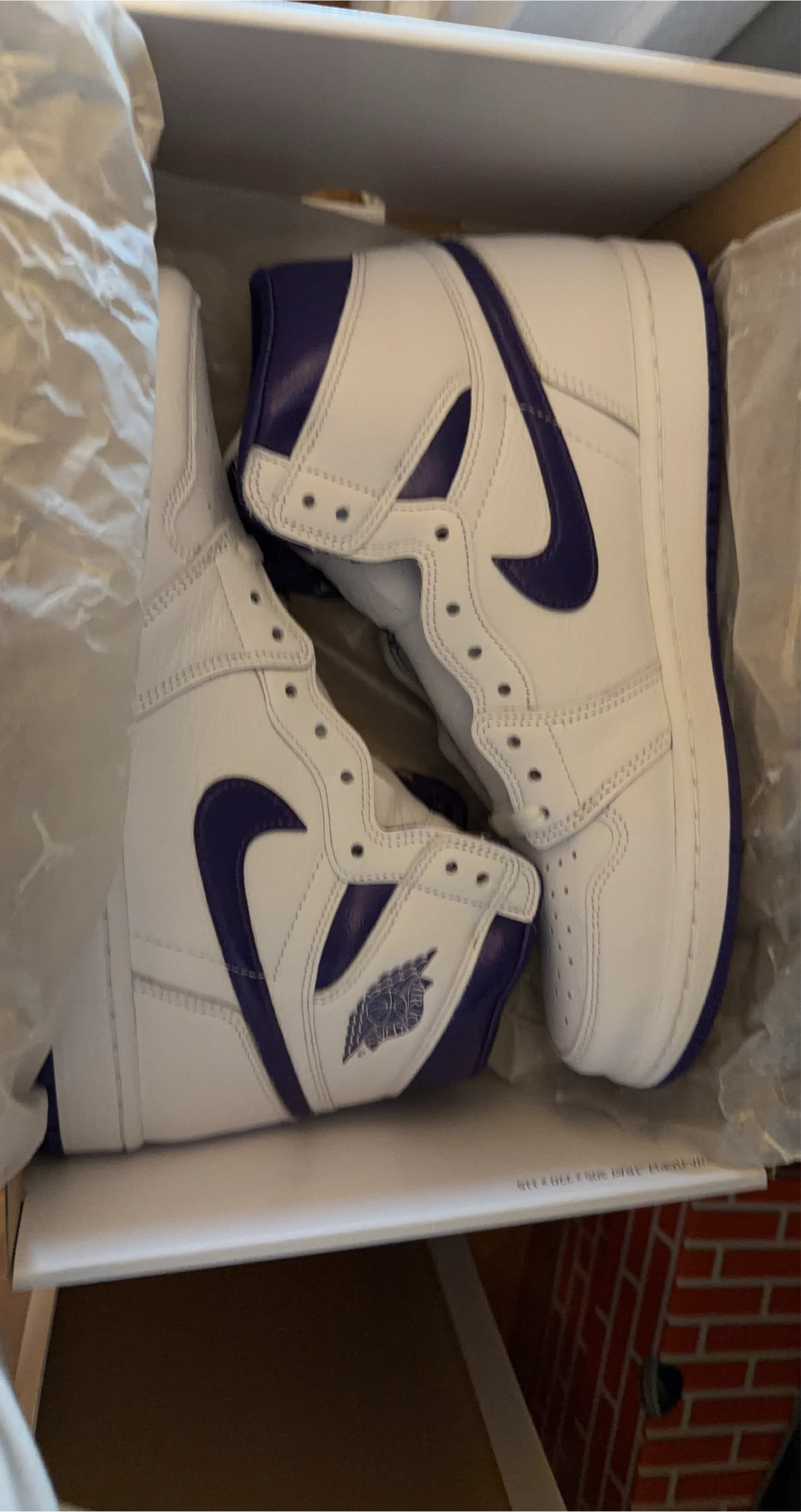 Selling a pair of Air Jordan 1 Retro High sneakers in White/Court Purple! They come with the original box. These shoes are in great condition and ready for a new owner