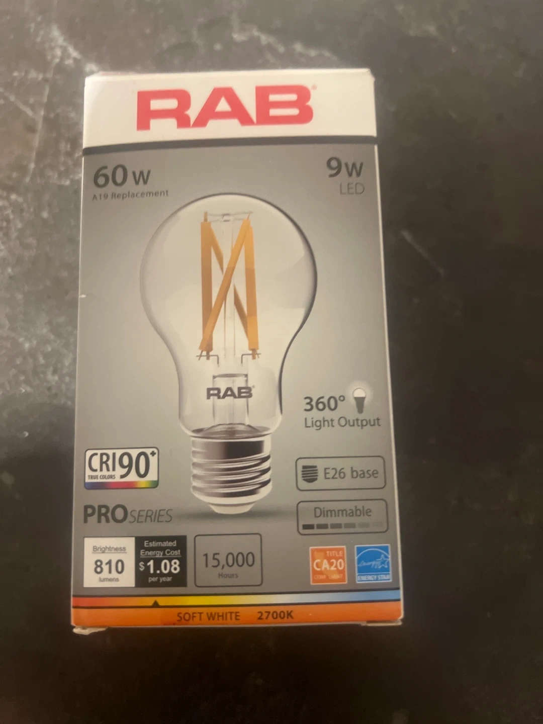 Selling a RAB 9W LED light bulb. It's an A19 replacement with a soft white (2700K) color temperature. Features include: