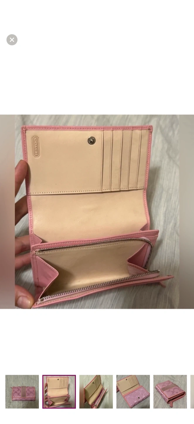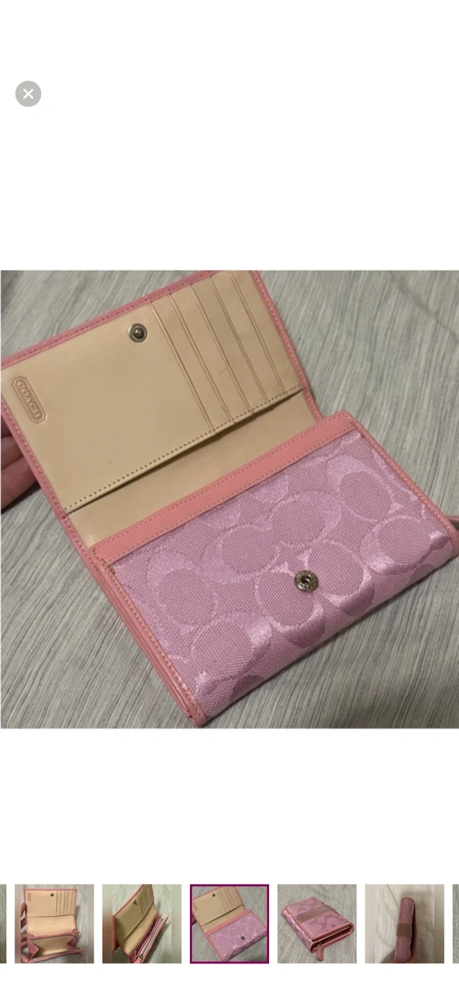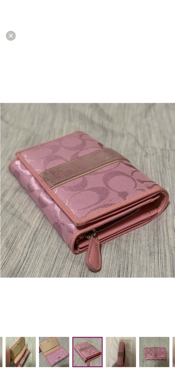 Selling a cute Coach wallet in pink-purple with the signature C pattern! It's in good condition and has a nice, compact design.