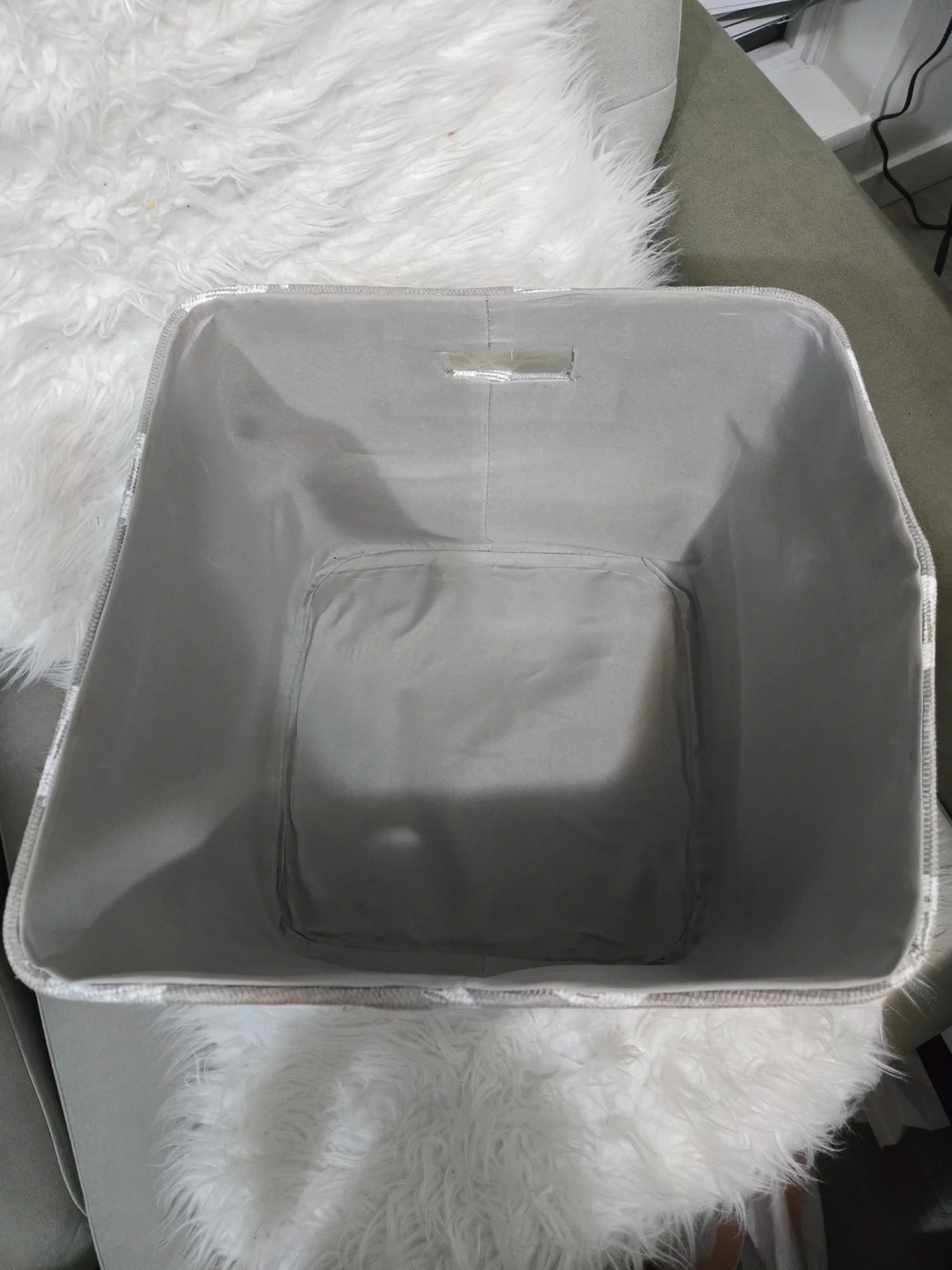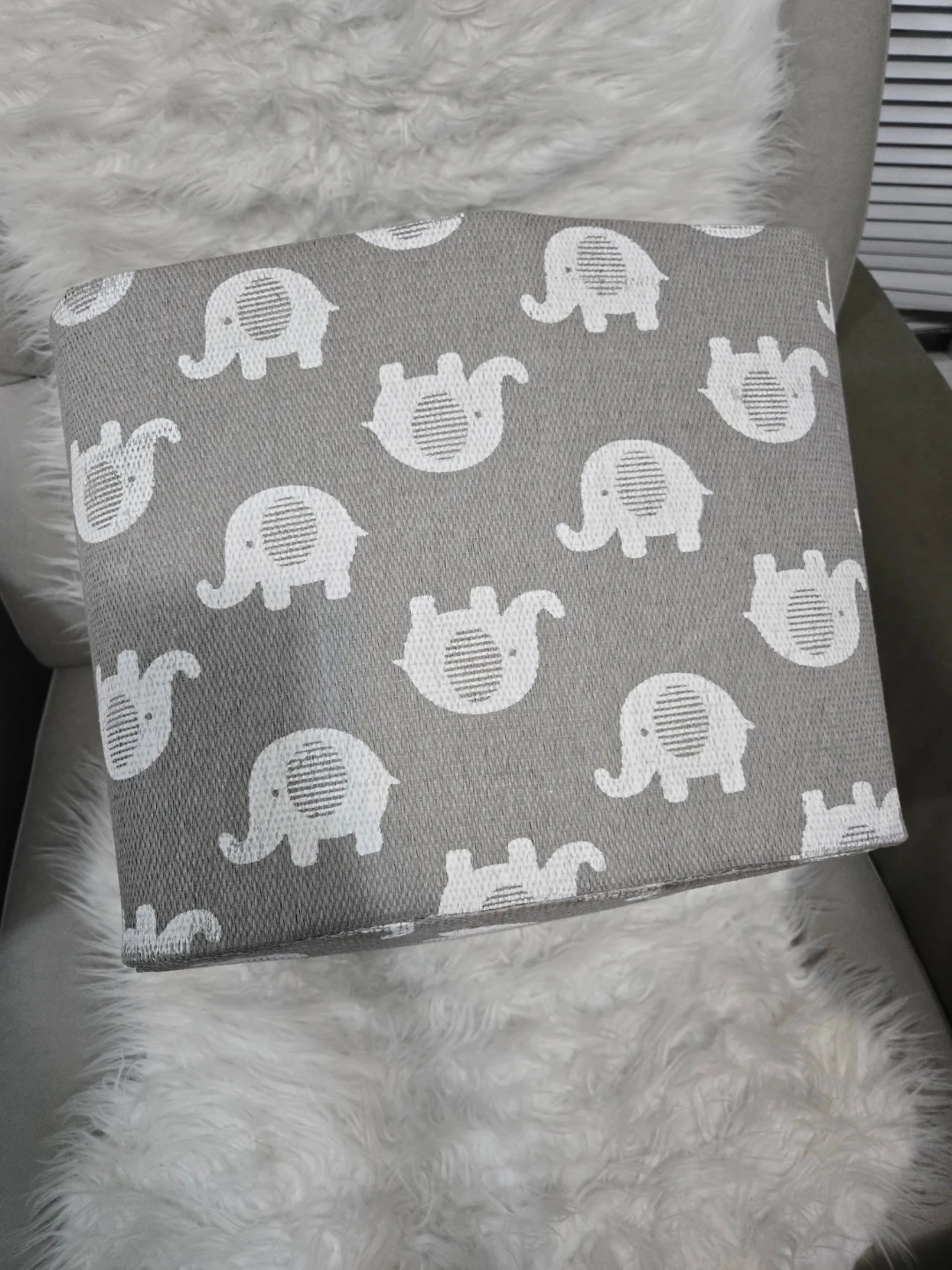 A cute storage bin with an elephant print! It's perfect for organizing toys, clothes, or other items in a nursery or kids' room. The bin is in great condition and ready to use