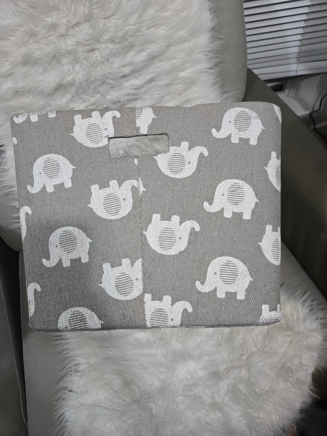 A cute storage bin with an elephant print! It's perfect for organizing toys, clothes, or other items in a nursery or kids' room. The bin is in great condition and ready to use