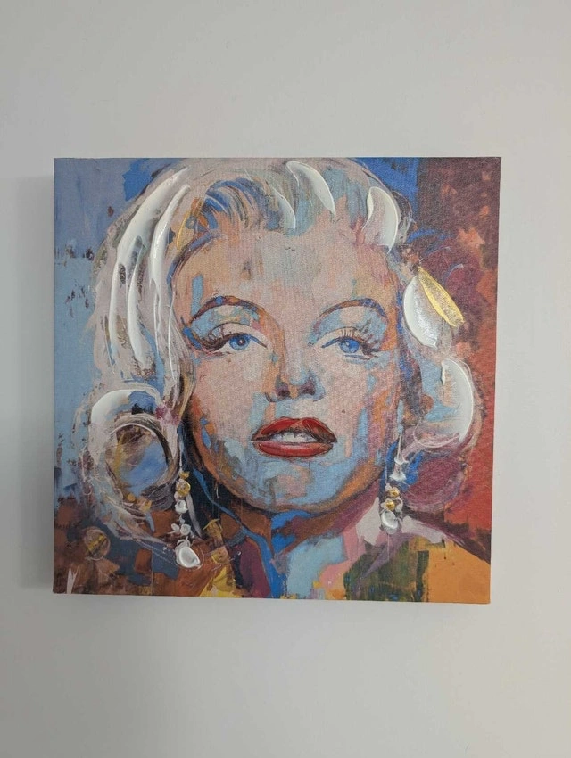 This striking Marilyn Monroe painting captures the iconic actress with vibrant colors and bold strokes. This is a used painting, and may have minor imperfections from handling. The painting is a unique piece of art that would add a touch of Hollywood glamour to any room. Unfortunately, specific details such as the artist's name, dimensions, and materials used are unavailable. Comparable art pieces are selling anywhere between $40-$150. If the ad is up, it's available! PICK UP ONLY. OPEN TO OFFERS.