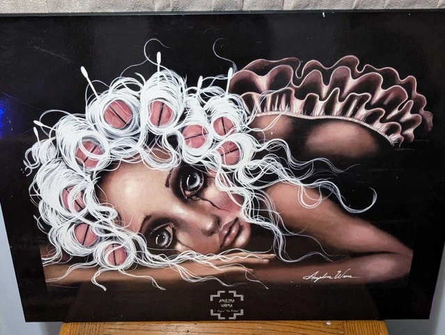 This captivating piece is an Angelina Wrona art print, showcasing surreal, big-eyed artistry on a sleek black background, sized at 18x24 inches. This piece adds a touch of edgy elegance to any room.