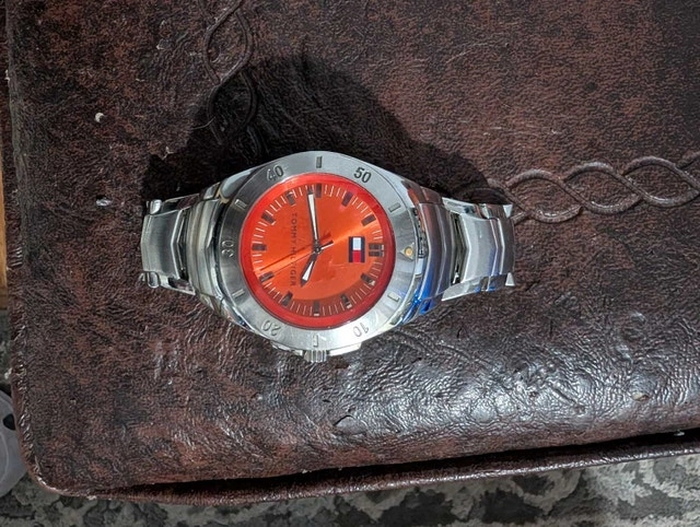 This Tommy Hilfiger watch features a vibrant orange face and a sleek stainless steel band. It has been previously worn and shows signs of wear. It needs a new battery and has a minor scuff on the glass but is in otherwise great condition. I have no use for it anymore as it just sits in my watch box. Pick up only! Text or message on here.
