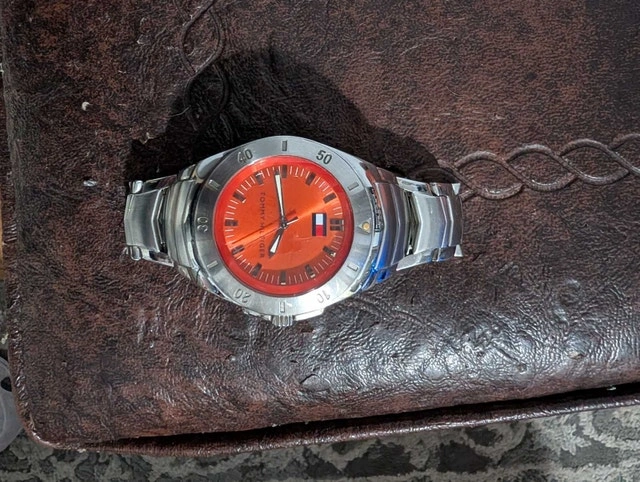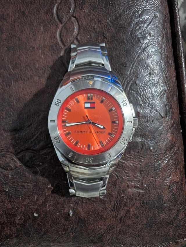 This Tommy Hilfiger watch features a vibrant orange face and a sleek stainless steel band. It has been previously worn and shows signs of wear. It needs a new battery and has a minor scuff on the glass but is in otherwise great condition. I have no use for it anymore as it just sits in my watch box. Pick up only! Text or message on here.
