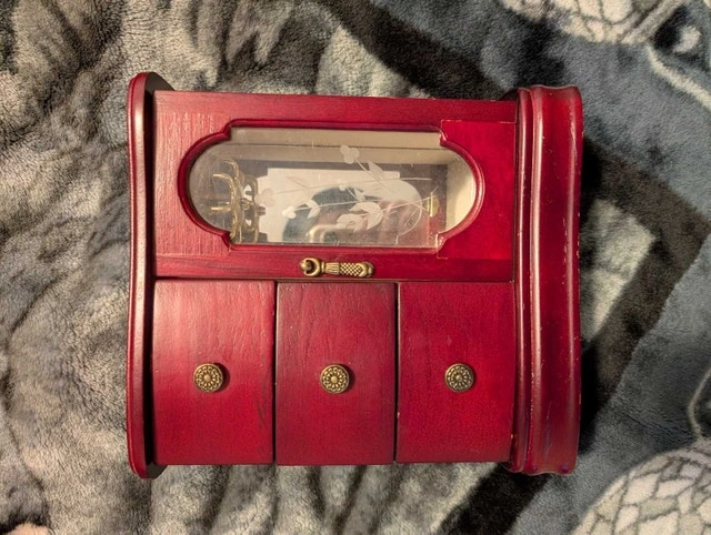 * Elegant, deep red colour. Looking to add a touch of class to your jewellery storage? This box could be yours! If the ad's up, it's available, so you don't have to wonder if it's still here – it is! Text or message on here. PICK UP ONLY!
