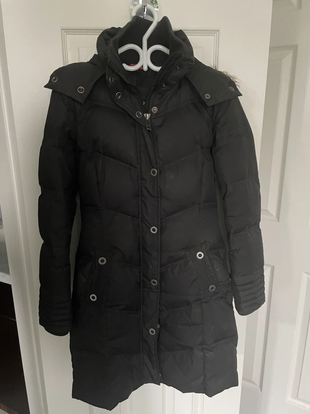 A stylish black winter coat from Esprit! It's in great condition and ready to keep you warm this winter. It features a faux fur-trimmed hood and a flattering, fitted silhouette. Porch pick up Yonge and 16th