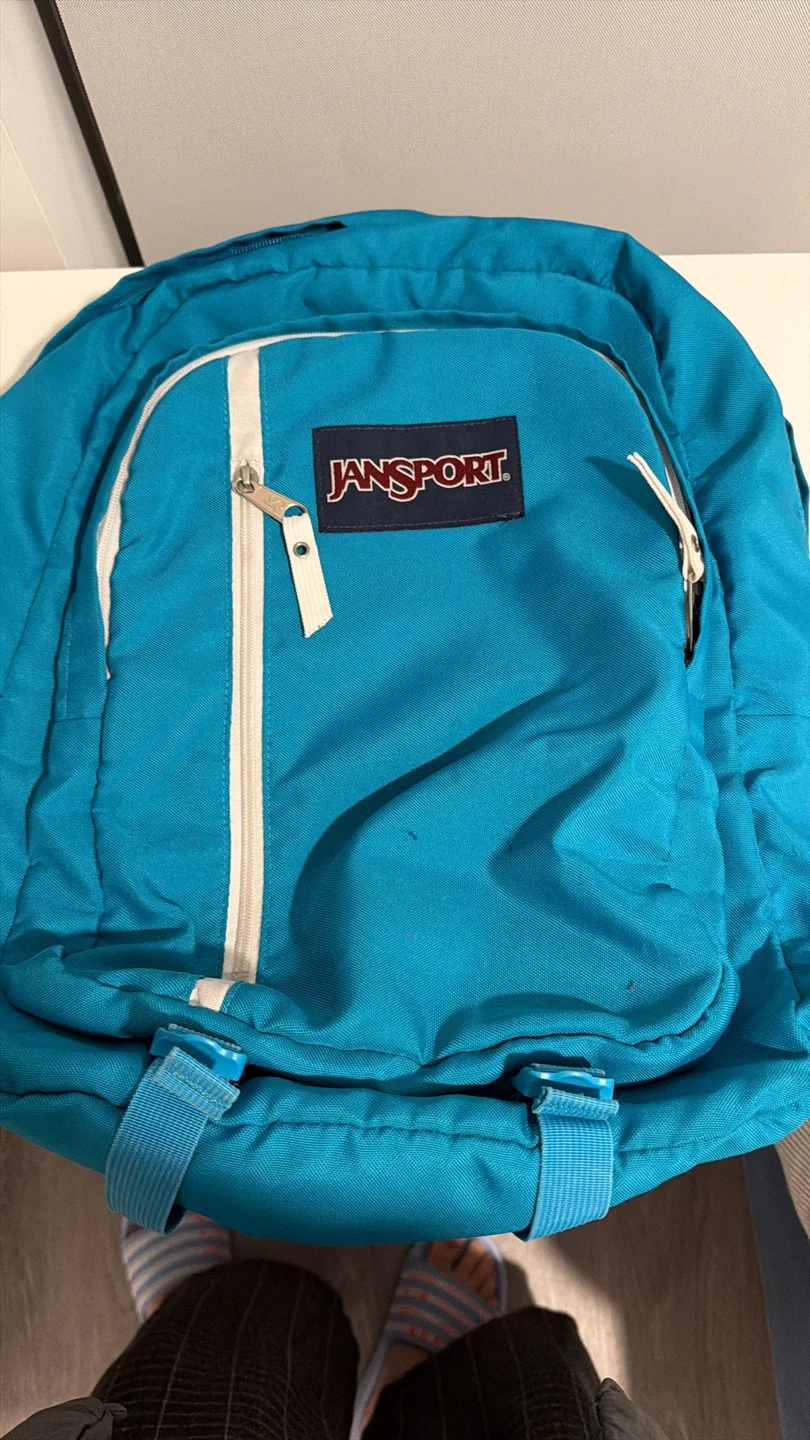 Selling a Jansport backpack in a vibrant turquoise colour! It's a classic and reliable backpack, perfect for school, work, or travel. It has some signs of wear, but still has plenty of life left