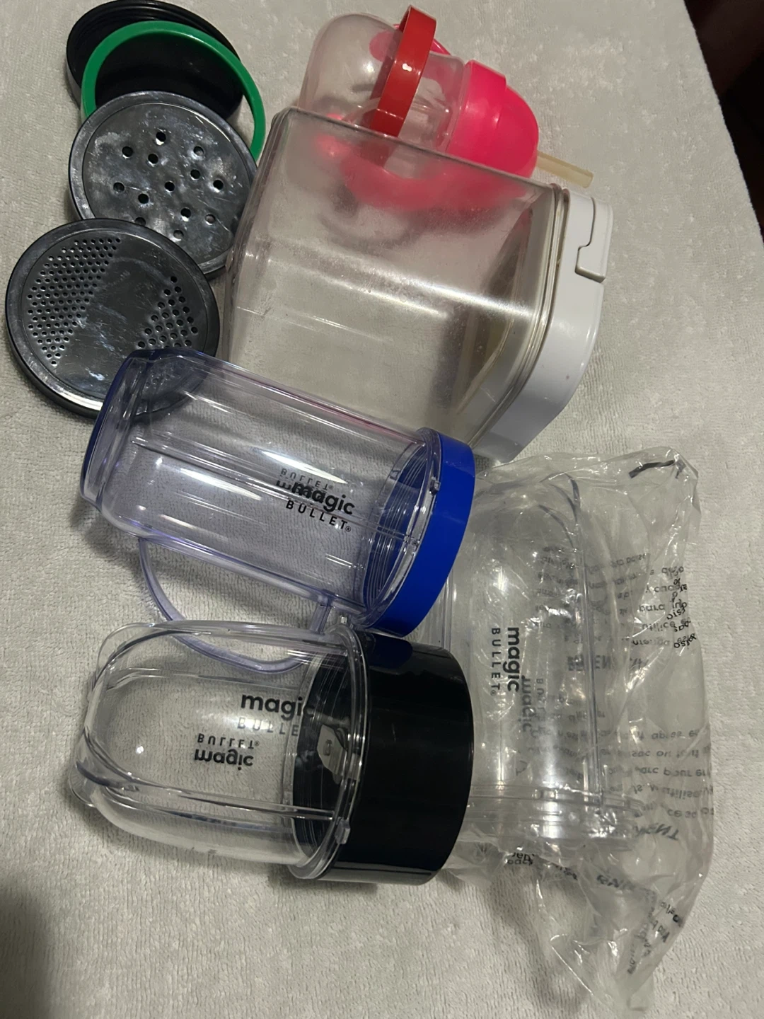 Selling a Magic Bullet blender set. Includes various attachments and cups, as shown in the photos. Great for making smoothies and other blended drinks!
