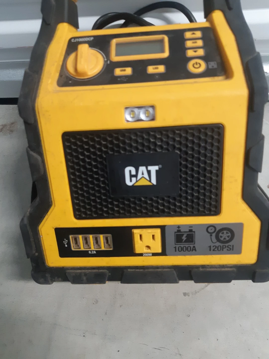 Selling a CAT CJ1000DCP jump starter. It features 1000A and 120PSI for jump starting and inflating tires. Includes USB ports and a 200W outlet for powering devices.