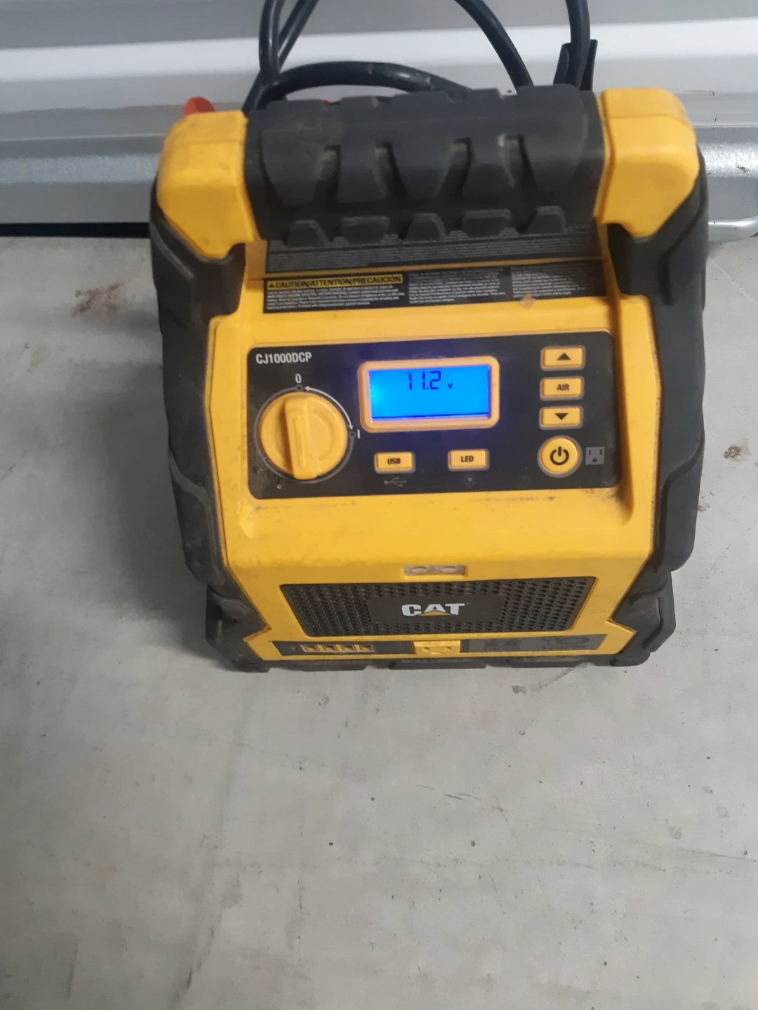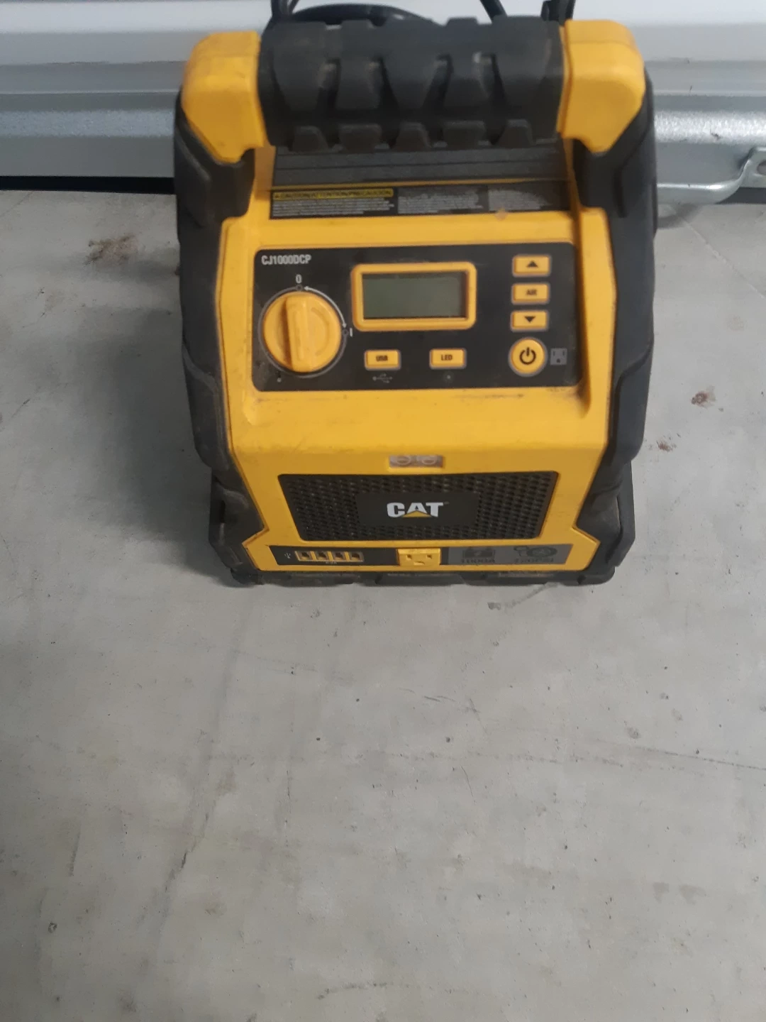 Selling a CAT CJ1000DCP jump starter. It features 1000A and 120PSI for jump starting and inflating tires. Includes USB ports and a 200W outlet for powering devices.