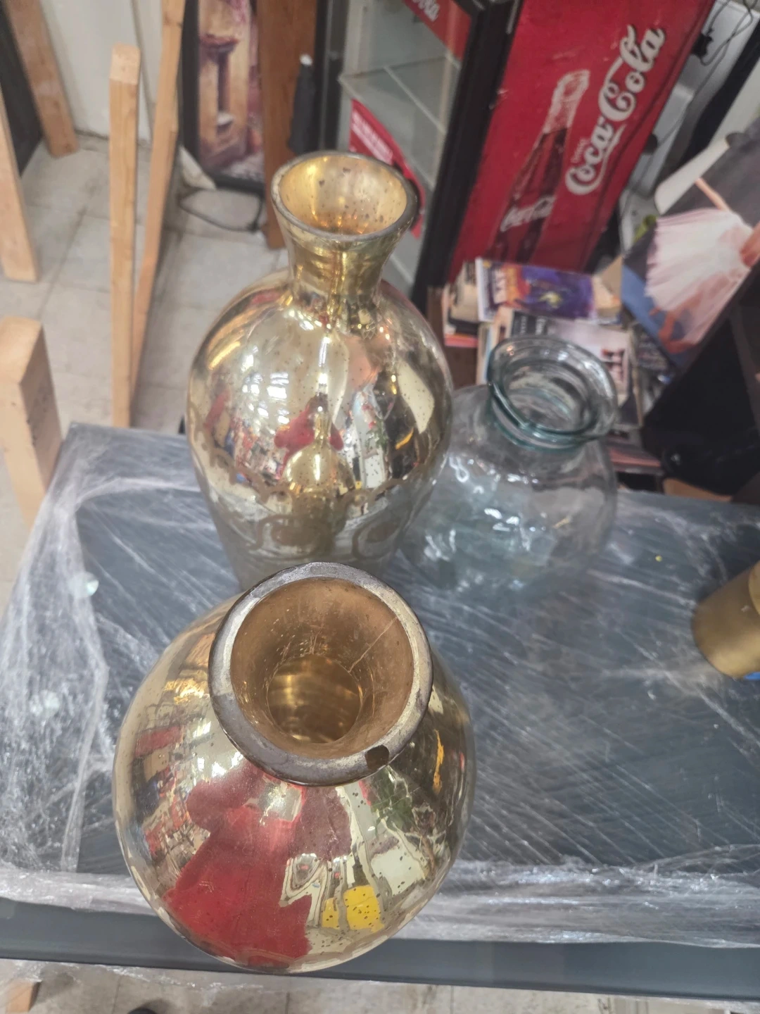 Selling a set of two decorative gold vases. They have a unique design and would look great as a centrepiece or accent in any room. They are in good condition and ready to brighten up your space!