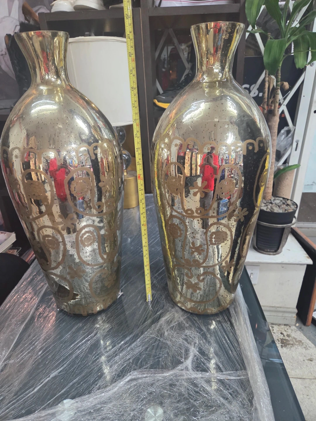Selling a set of two decorative gold vases. They have a unique design and would look great as a centrepiece or accent in any room. They are in good condition and ready to brighten up your space!