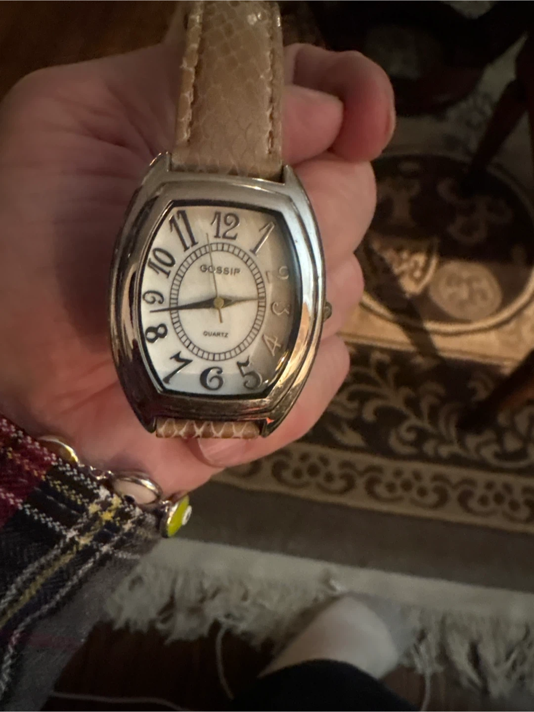 Selling a Gossip Quartz watch. The watch has a silver-tone case and a light brown faux snakeskin strap. It's a stylish accessory for any outfit battery required