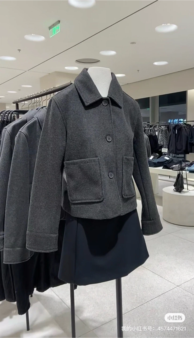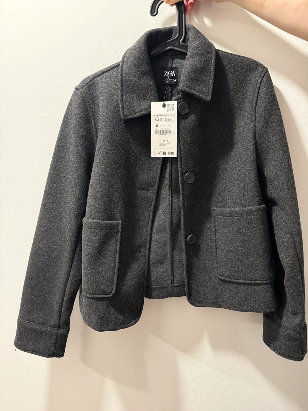 Selling a gently used Zara wool blend jacket in size XS. It's a stylish and versatile piece, perfect for layering during the cooler months. The jacket features a classic design with front pockets and button closure. The neutral grey colour makes it easy to pair with any outfit!