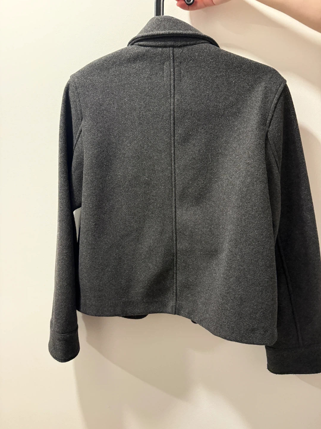 Selling a gently used Zara wool blend jacket in size XS. It's a stylish and versatile piece, perfect for layering during the cooler months. The jacket features a classic design with front pockets and button closure. The neutral grey colour makes it easy to pair with any outfit!