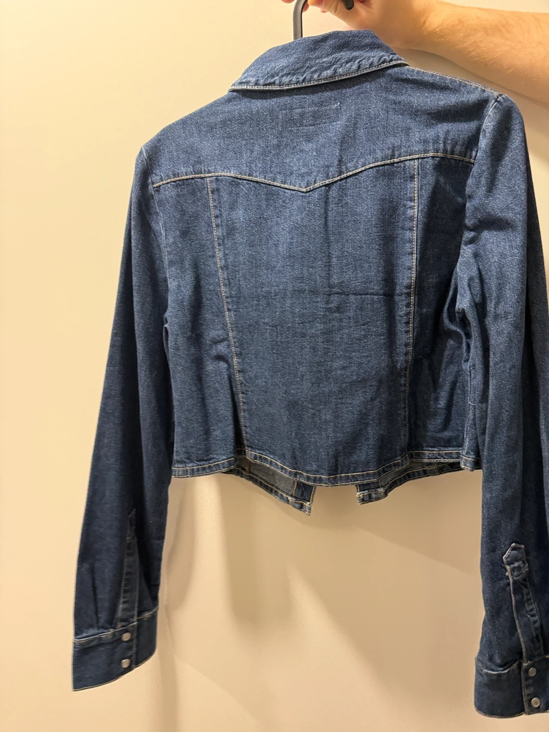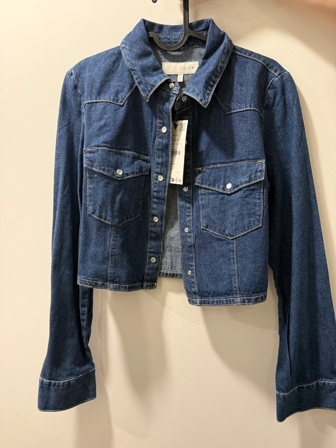 Selling a Zara denim jacket in size small! It's in great condition and ready for a new owner. Classic denim look that’s perfect for layering or wearing on its own.