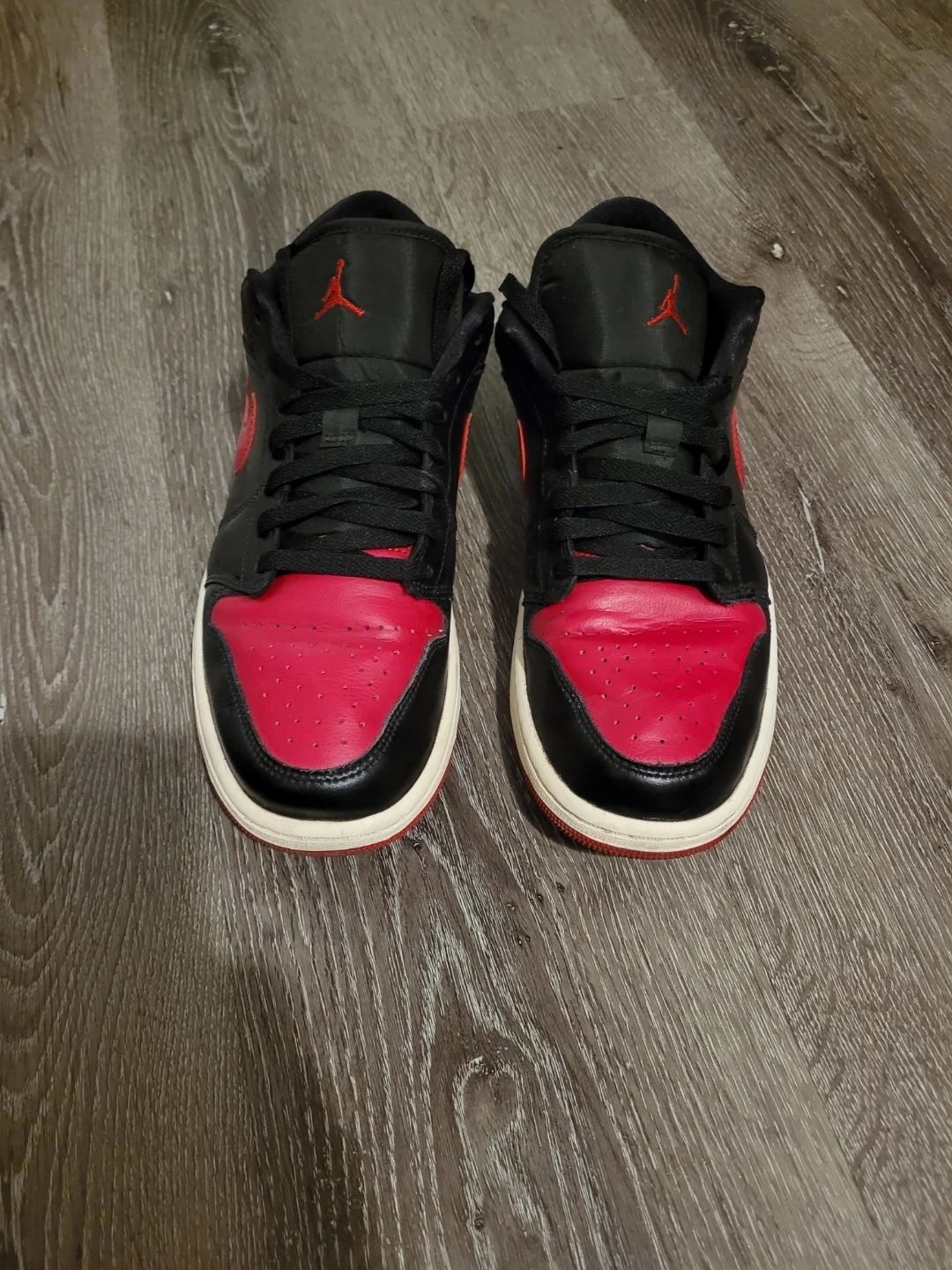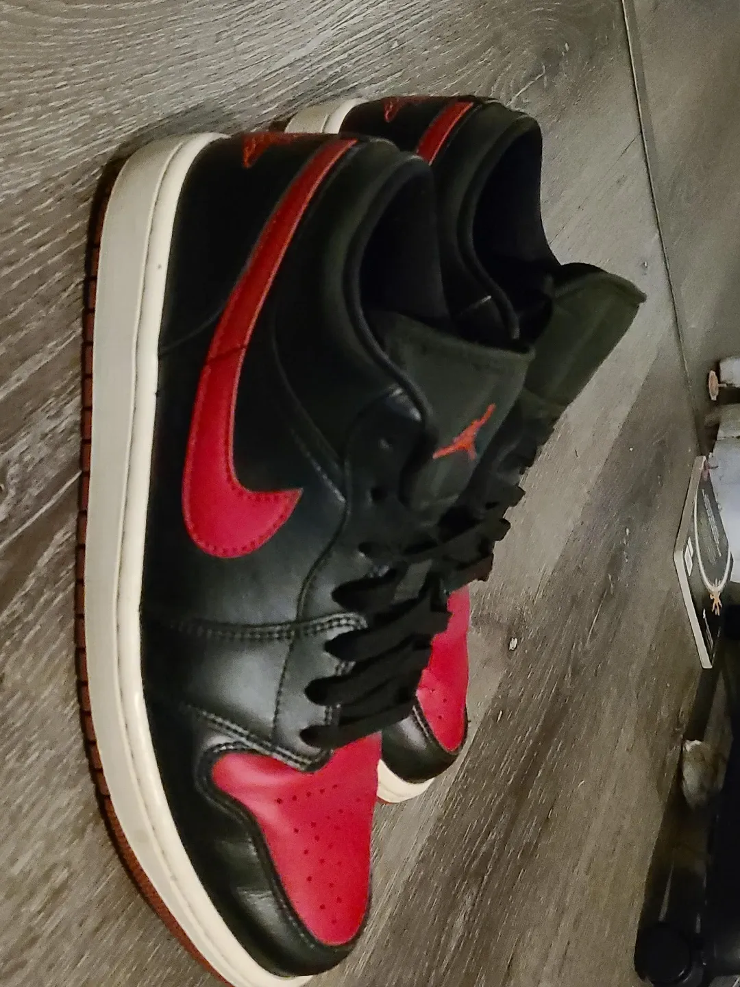Selling a pair of Nike Air Jordan 1 Lows in black and red. They are size 10 US and in good condition!