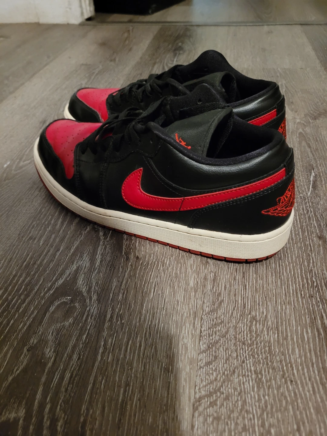 Selling a pair of Nike Air Jordan 1 Lows in black and red. They are size 10 US and in good condition!
