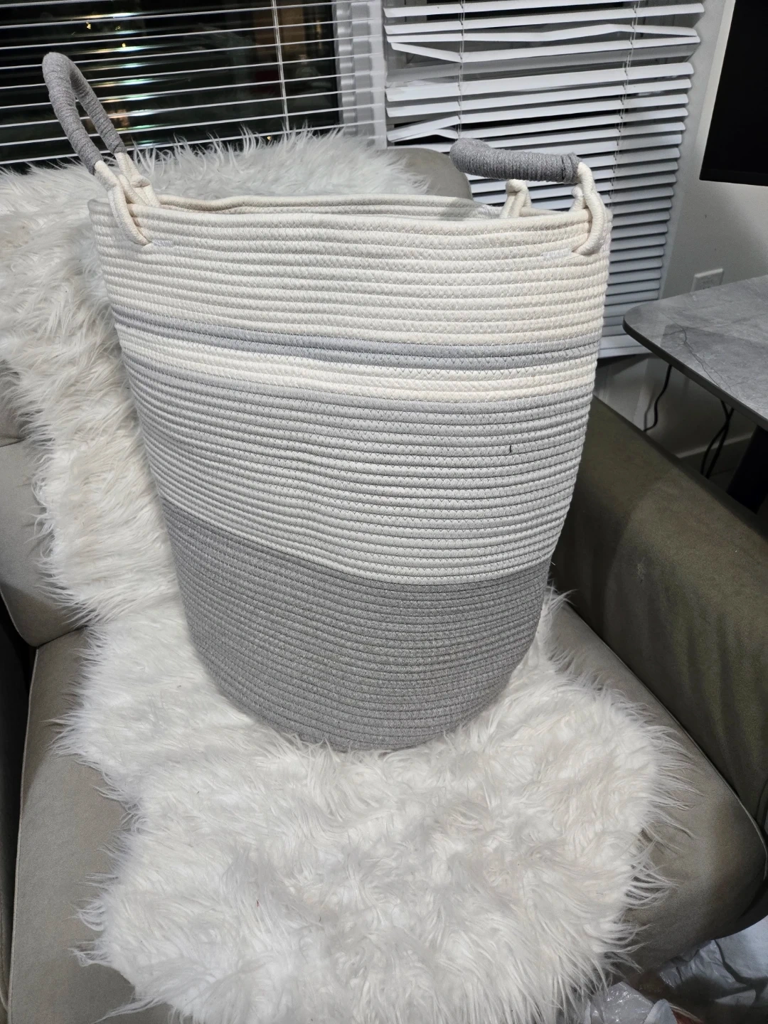 This SIXDOVE laundry basket is perfect for a baby's nursery or any room in the house! It's a foldable laundry hamper made with 100% natural cotton. It's great for storing blankets, clothes, or toys. The hamper is grey and measures 13.8" L x 19.7" H, never used, I got it as a gift and couldn't return it