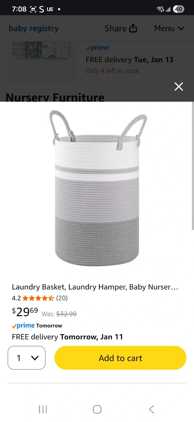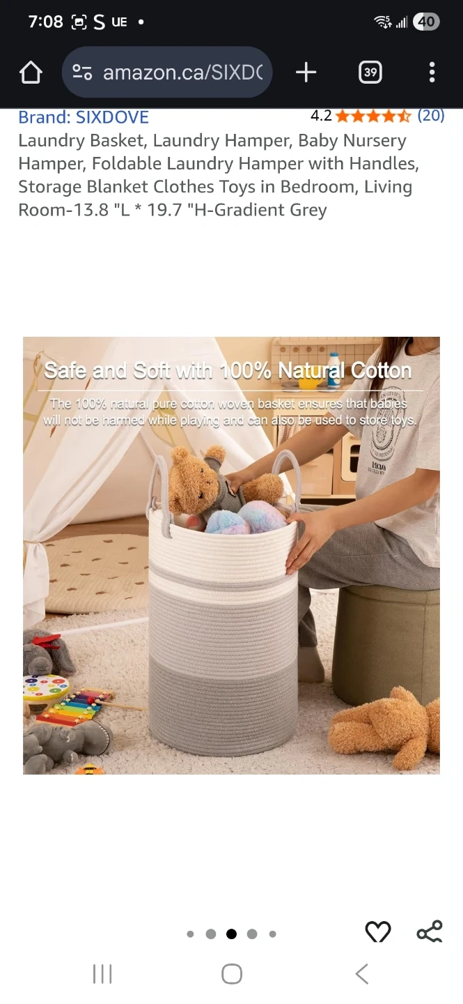 This SIXDOVE laundry basket is perfect for a baby's nursery or any room in the house! It's a foldable laundry hamper made with 100% natural cotton. It's great for storing blankets, clothes, or toys. The hamper is grey and measures 13.8" L x 19.7" H, never used, I got it as a gift and couldn't return it