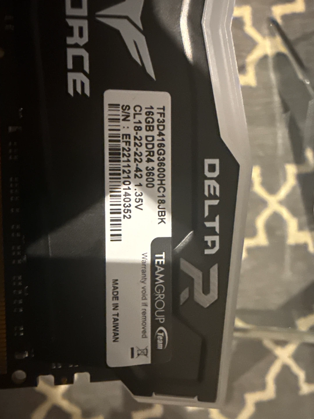 Selling a set of Teamgroup T-Force Delta RGB RAM modules. Each module is 16GB DDR4 3600, for a total of 32GB. They run at 1.35V with timings of CL18-22-22-42. Great for upgrading your PC!