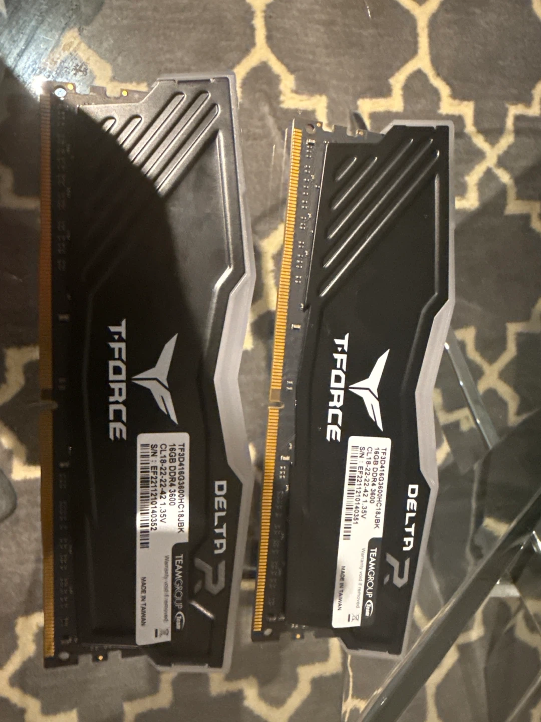 Selling a set of Teamgroup T-Force Delta RGB RAM modules. Each module is 16GB DDR4 3600, for a total of 32GB. They run at 1.35V with timings of CL18-22-22-42. Great for upgrading your PC!