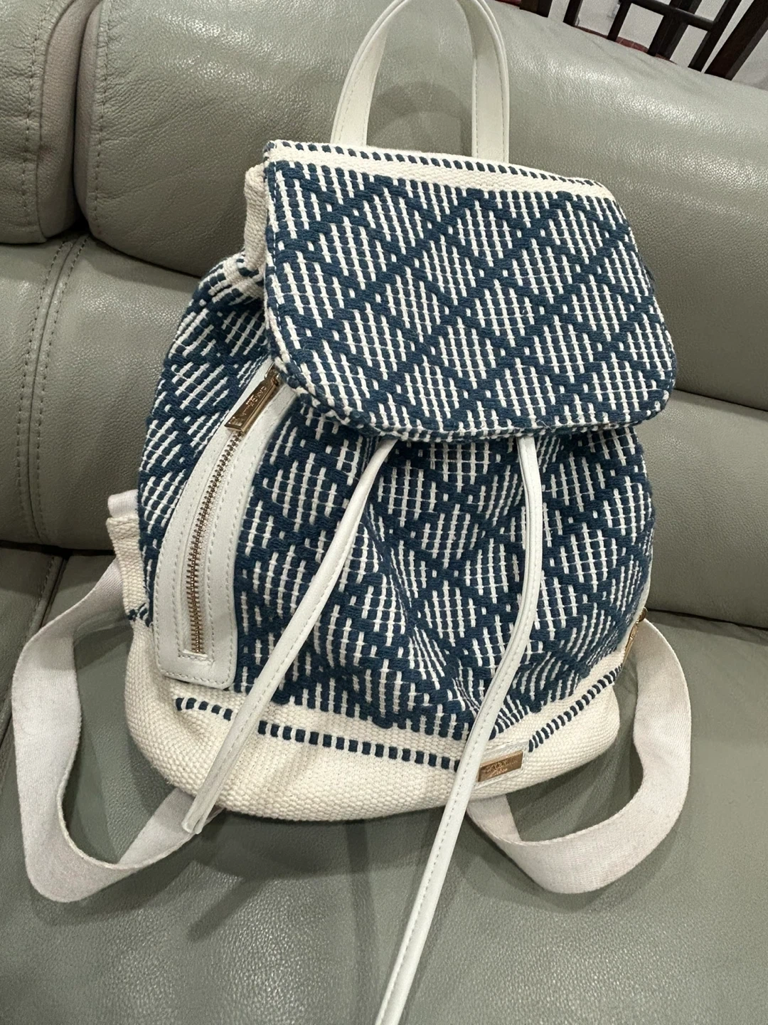 This Matt & Nat backpack features a unique blue and white woven design. It's in great condition and ready for your next adventure! The backpack has white straps and zipper accents, adding a stylish touch to its overall look