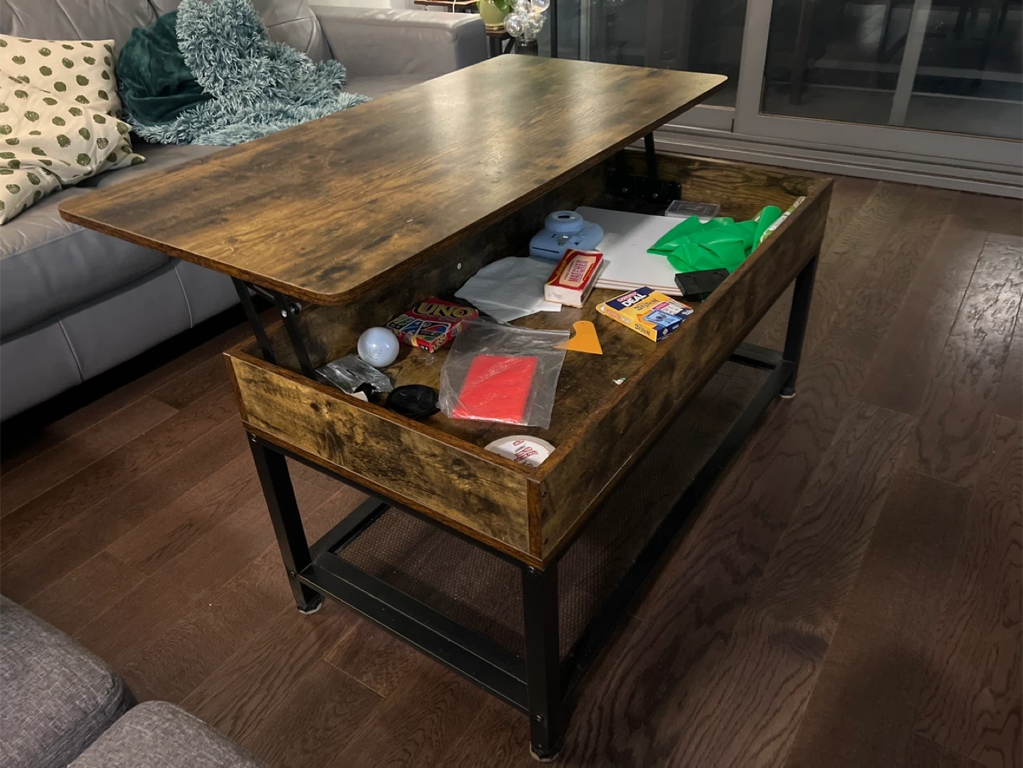 Selling a lift-top coffee table in rustic brown. It's a versatile piece that can be used as a regular coffee table or lifted to create a comfortable workspace or dining surface. It also offers ample storage space inside!
