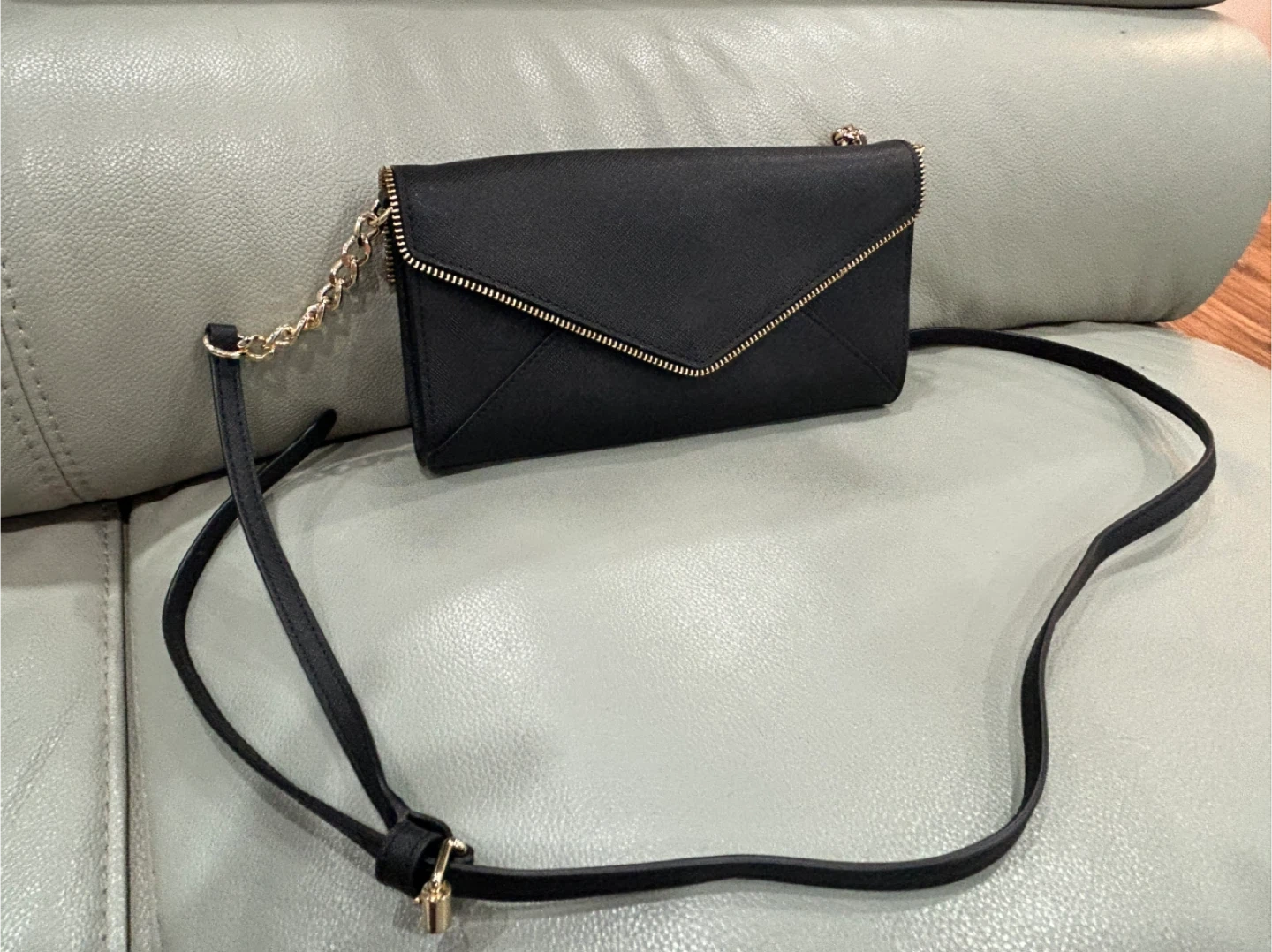 Selling a Rebecca Minkoff black envelope crossbody bag. It features a stylish envelope design with a gold zipper accent and a chain detail. Perfect for adding a touch of elegance to any outfit!