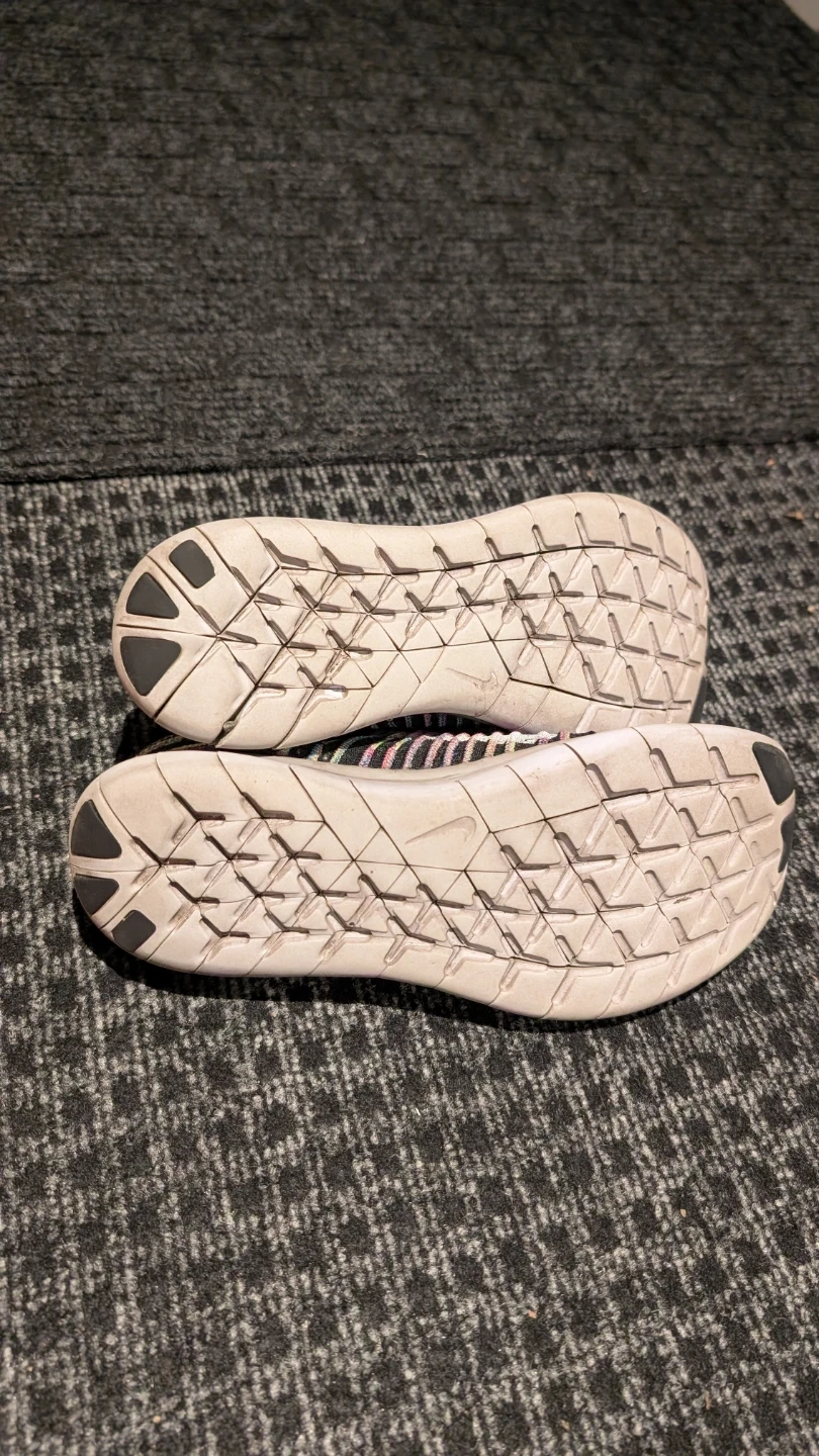 Selling a pair of Nike Free RN Flyknit running shoes! They feature a black knit upper with colourful stripes. Great for running or casual wear. I think it's size 7.5 or 8. No size markings.