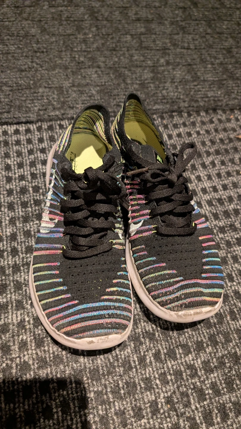 Selling a pair of Nike Free RN Flyknit running shoes! They feature a black knit upper with colourful stripes. Great for running or casual wear. I think it's size 7.5 or 8. No size markings.