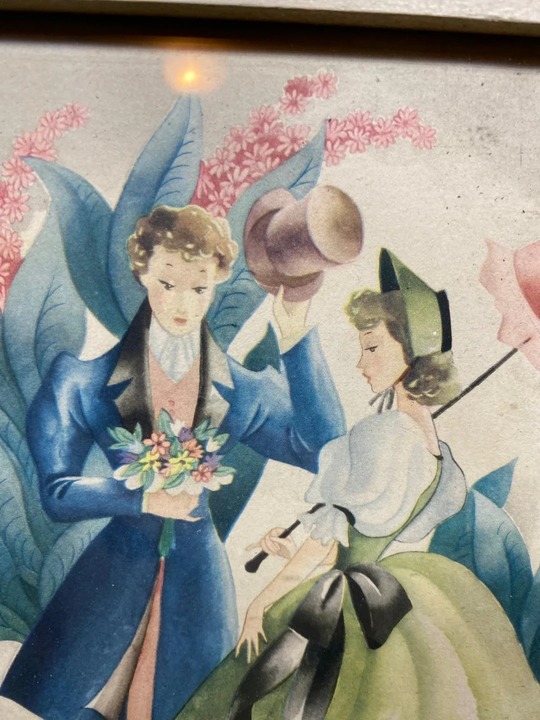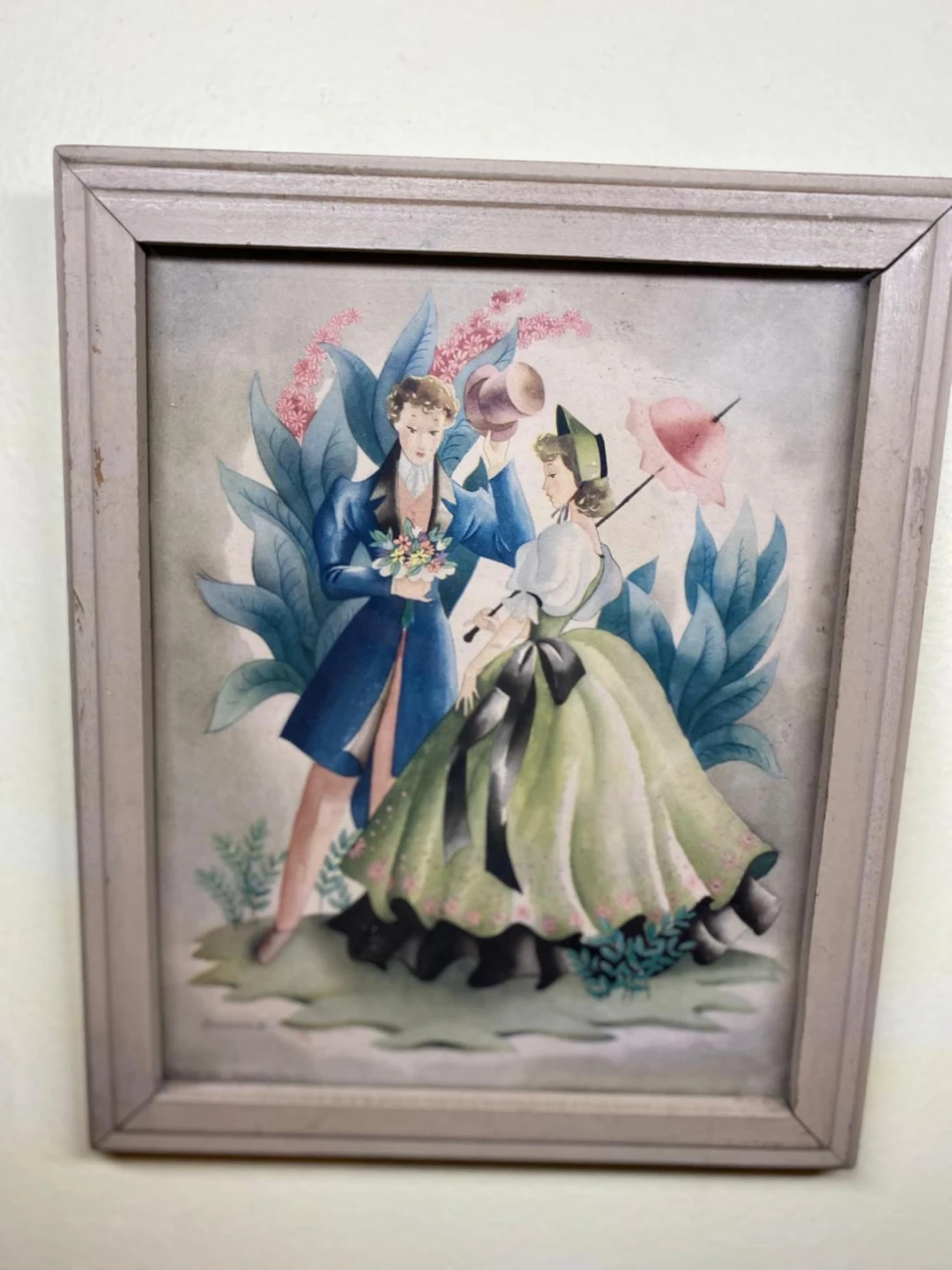 Selling a vintage framed picture from Bernard Picture Co., Inc. The copyright indicates it's from 1943, so it's a pretty cool piece of history! The picture features a couple in period clothing with floral and foliage accents. A charming addition to any collection or decor