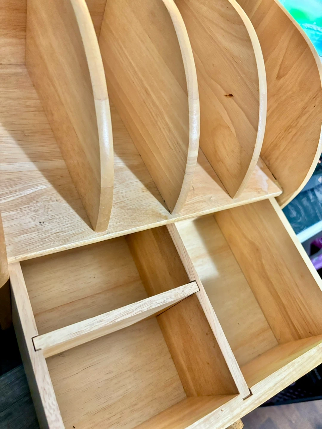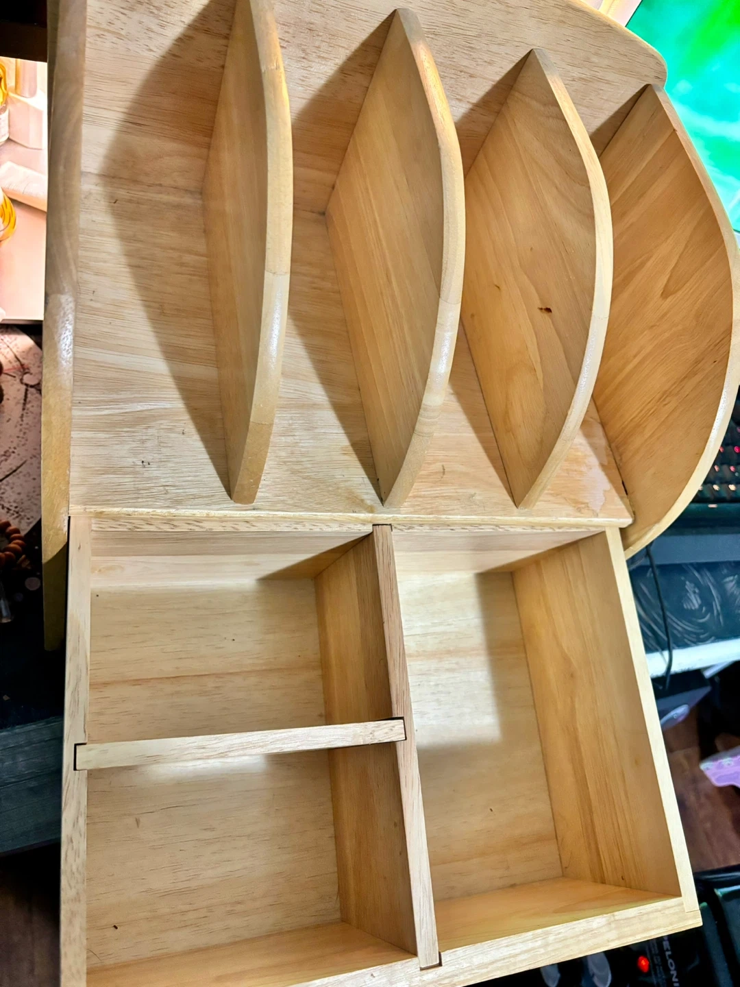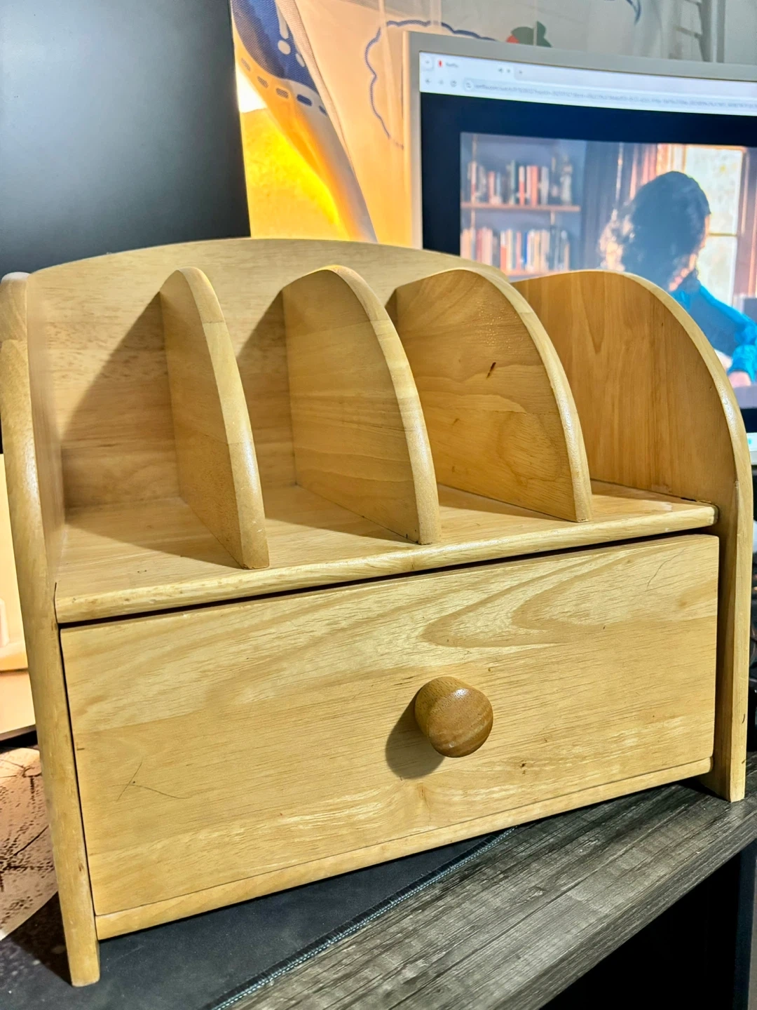 Description: Here's a solid handy wooden desk organizer, perfect for keeping your workspace tidy! It features multiple slots for files and books, plus a convenient drawer for smaller items. Clean, no major damage, and ready to use. Great for home or office use